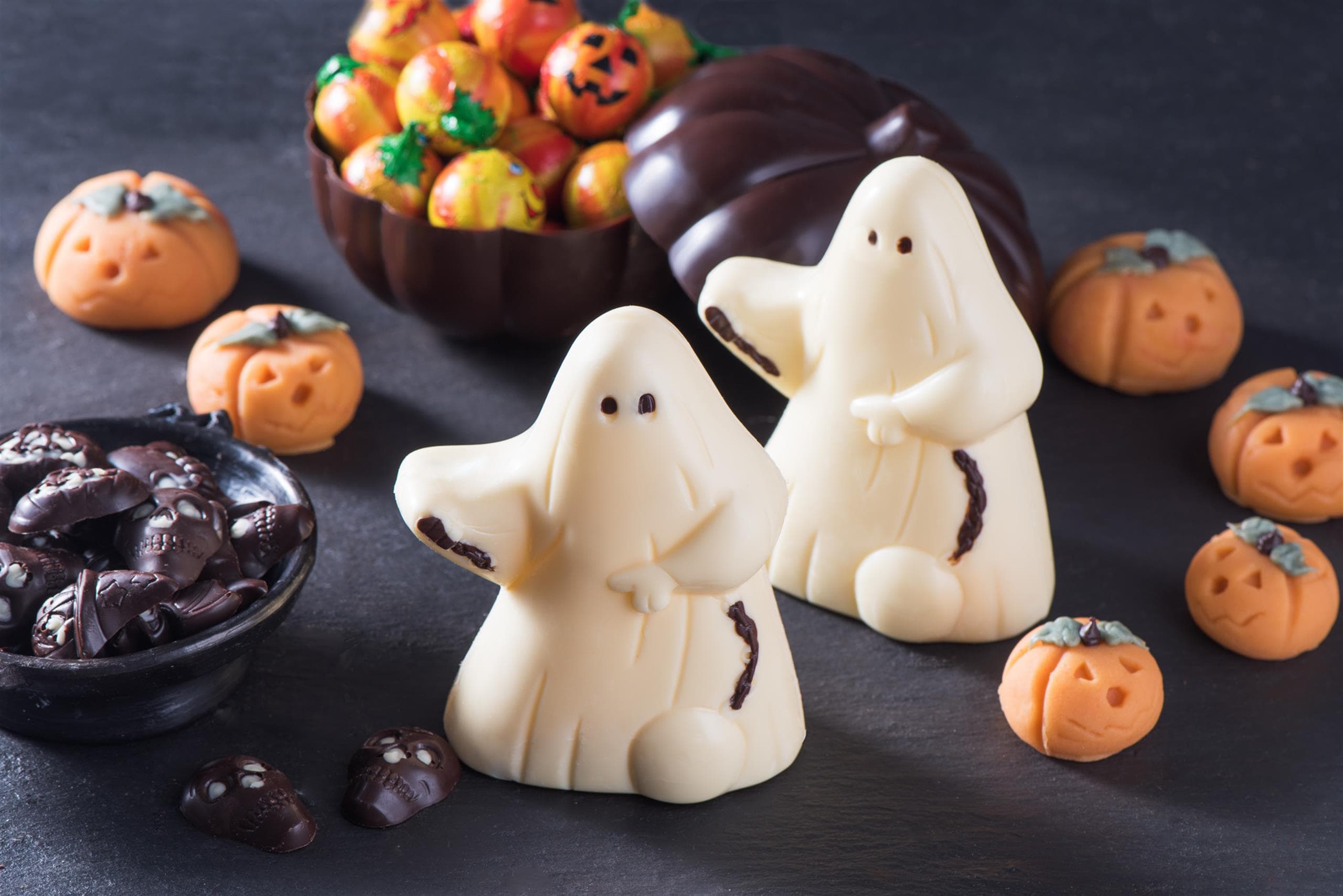 Fantasmi di cioccolato e zucche di marzapane per dolcetto o scherzetto