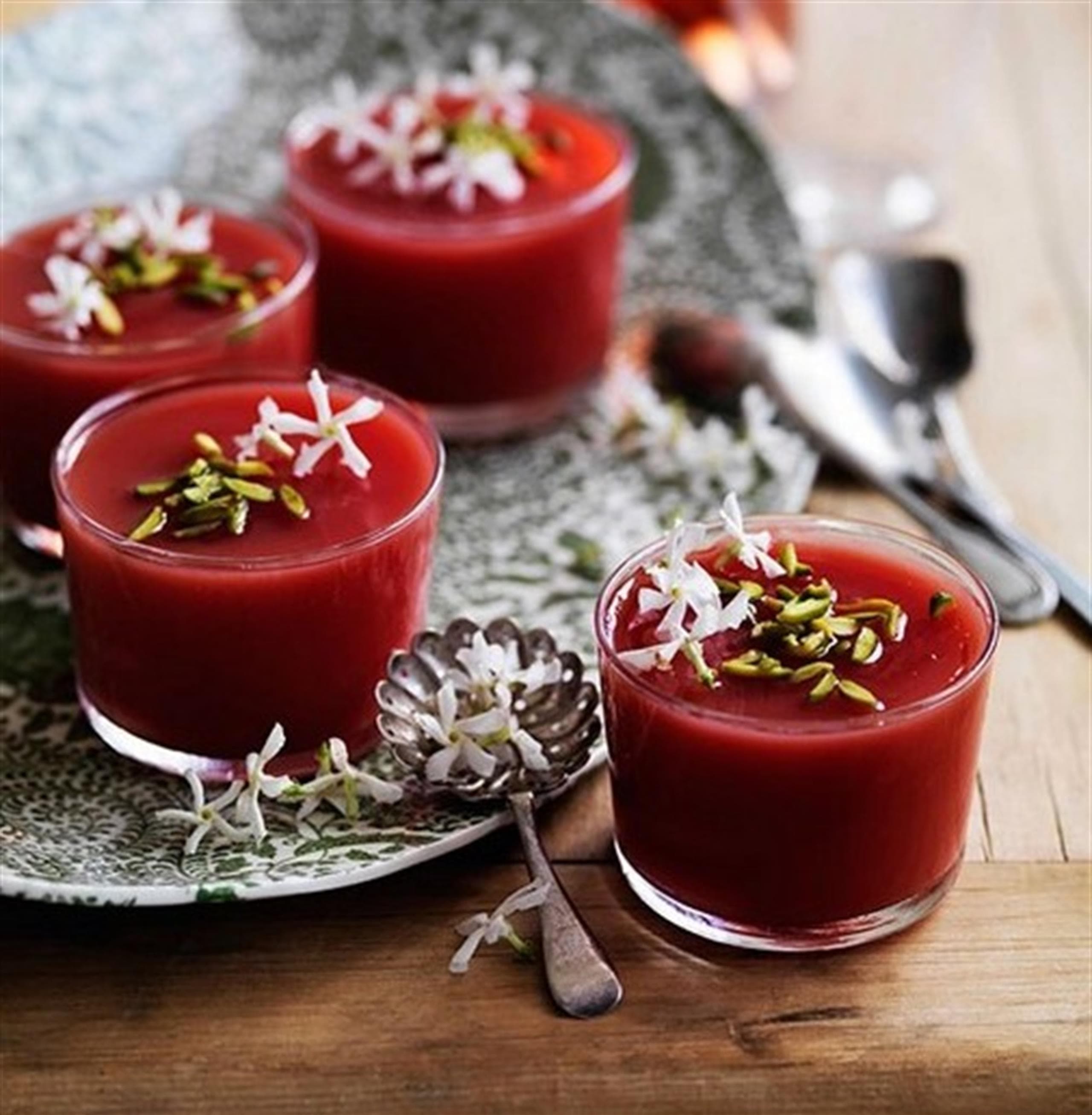 Servite decorando ogni coppetta con una manciata di granella di pistacchio e un fiore di gelsomino.