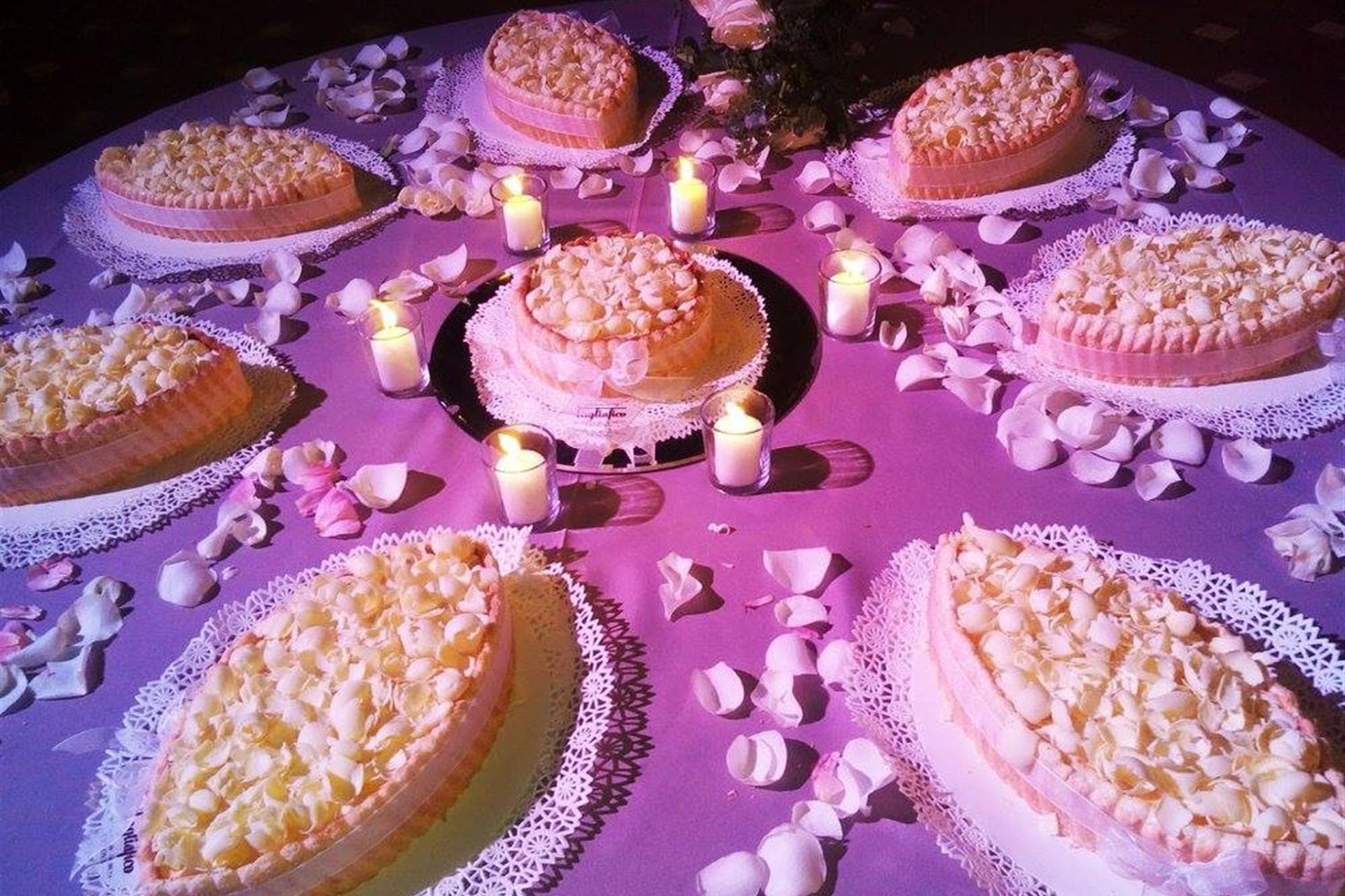 Il giorno del matrimonio, quando l’ultima sfoglia di cioccolato è stata appoggiata sull’ultima delle charlotte, realizziamo nel nostro laboratorio un allestimento fittizio. Fotografato e inviato con il cellulare servirà da modello agli sposi e ai loro collaboratori per creare la base floreale definitiva. Non ce la sentiamo di mandare la foto di un tavolo spoglio e improvvisiamo una semplice scenografia con qualche candela e una manciata di petali. Non è niente rispetto a quello che più tardi gli sposi e i loro invitati troveranno quando raggiungeranno il tavolo del banchetto, ma ci sentiamo comunque soddisfatti. Perché oggi abbiamo celebrato assieme al matrimonio dei nostri amici anche quello fra arte dolciaria e floreale.