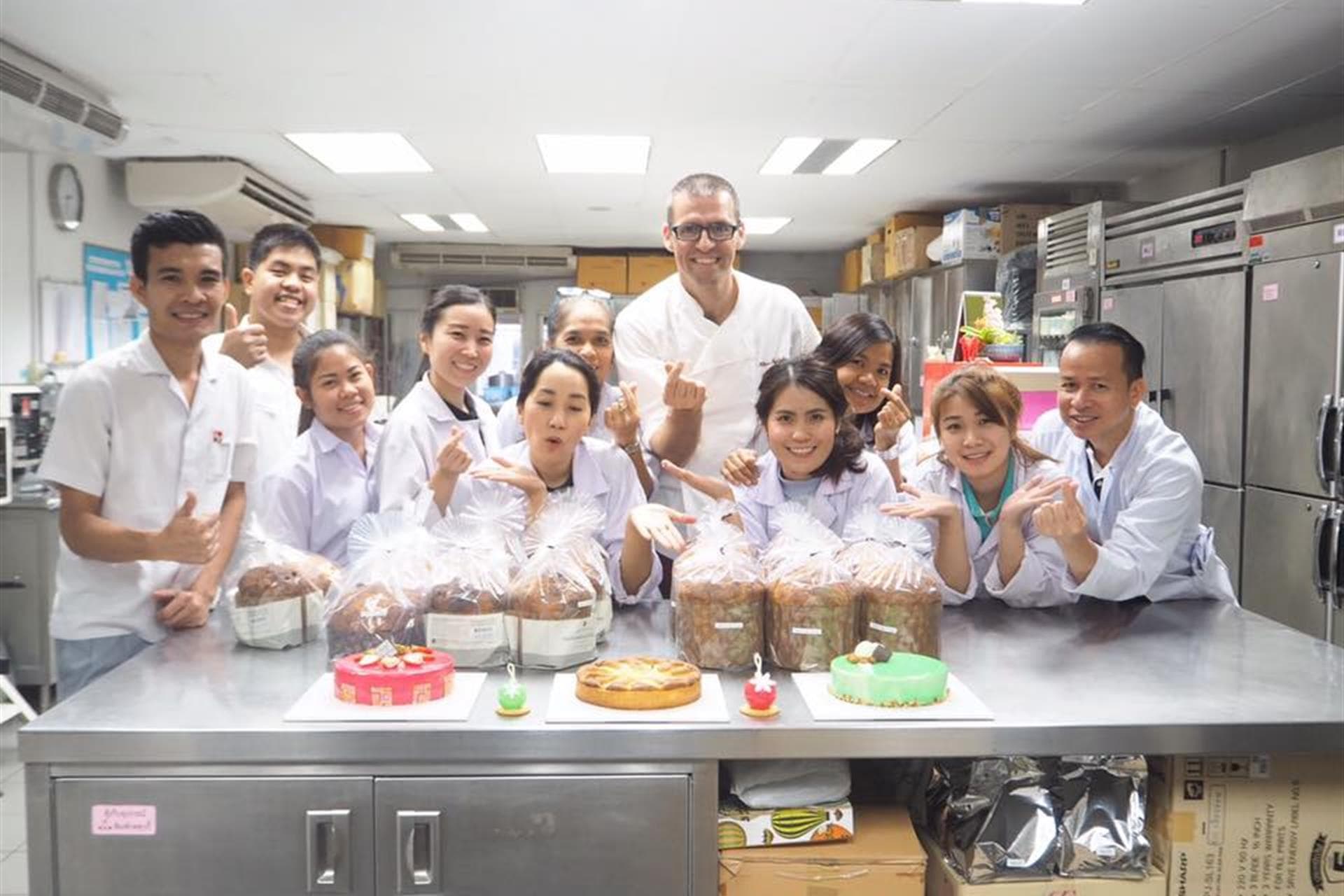 Riprendo le lezioni sulle torte e sui frollini e quando arriva il momento inforniamo. Anche se il titolare ripete il suo detto non riesco a trattenermi dal controllare i progressi di quelli che potrebbero diventare i primi panettoni made in Thailandia. Nel momento in cui apriamo il forno il profumo sembra travolgere i miei collaboratori. Vorrebbero divorarli subito ma resta ancora un ultimo passaggio da affrontare. I panettoni sono cotti ma la loro forma non si è ancora stabilizzata. E’ a questo punto, per garantire che presentino la tipica forma a cupola, che entro in azione con i miei spadoni. Li infilzo, li capovolgo e li allineo su due supporti dove riposeranno fino alla sera.