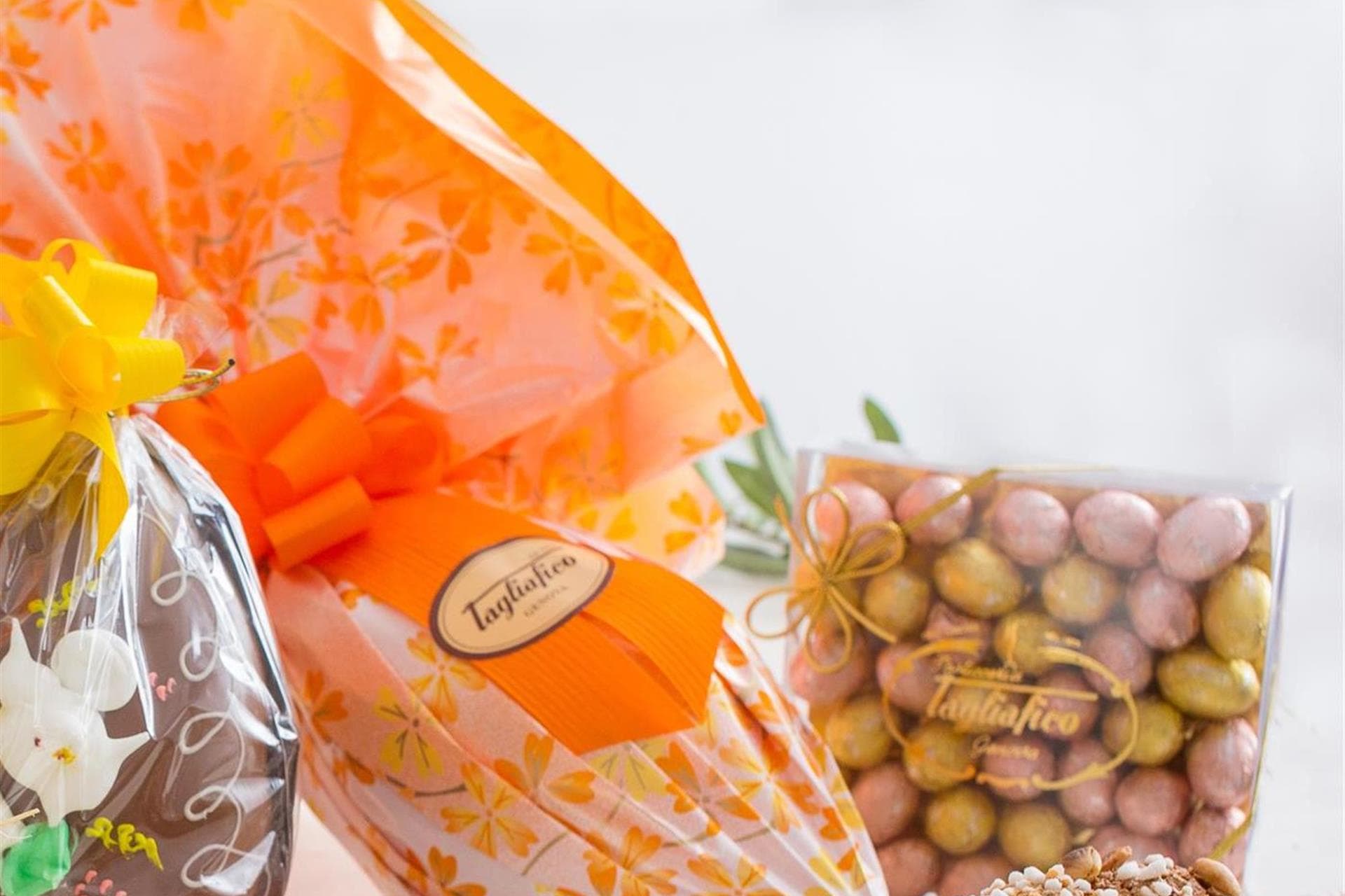 Le uova di Pasqua a fazzoletto della pasticceria Tagliafico sono preparate con cioccolato fondente al 70% o cioccolato al latte e confezionate in carta colorata decorata con un fiocco proporzionato alla grandezza dell’uovo.
