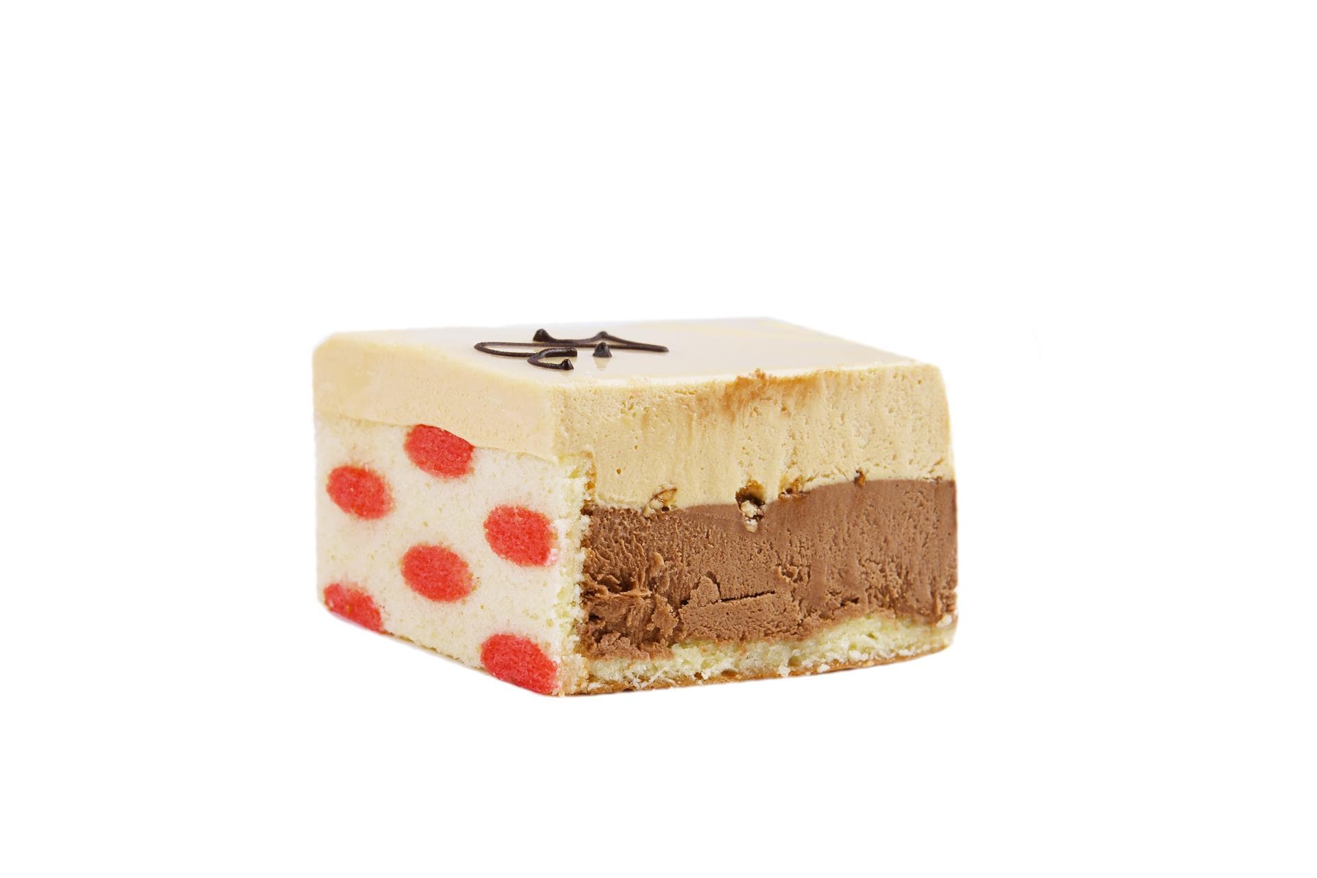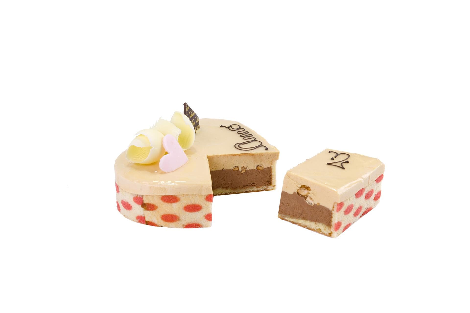 Il ripieno è formato da uno strato di crema bavarese al cioccolato, impreziosita da pezzi di croccante nocciola caramellata, ricoperto da un secondo strato di mousse al caramello.