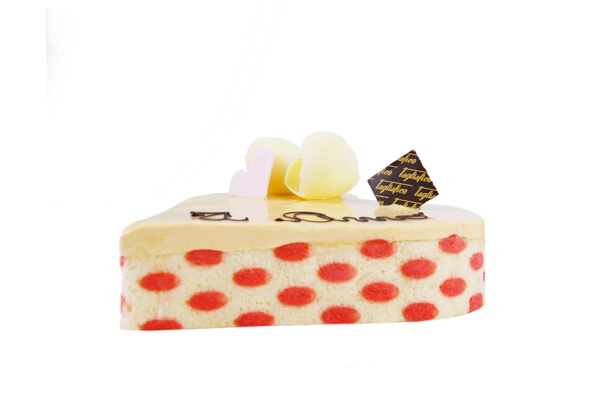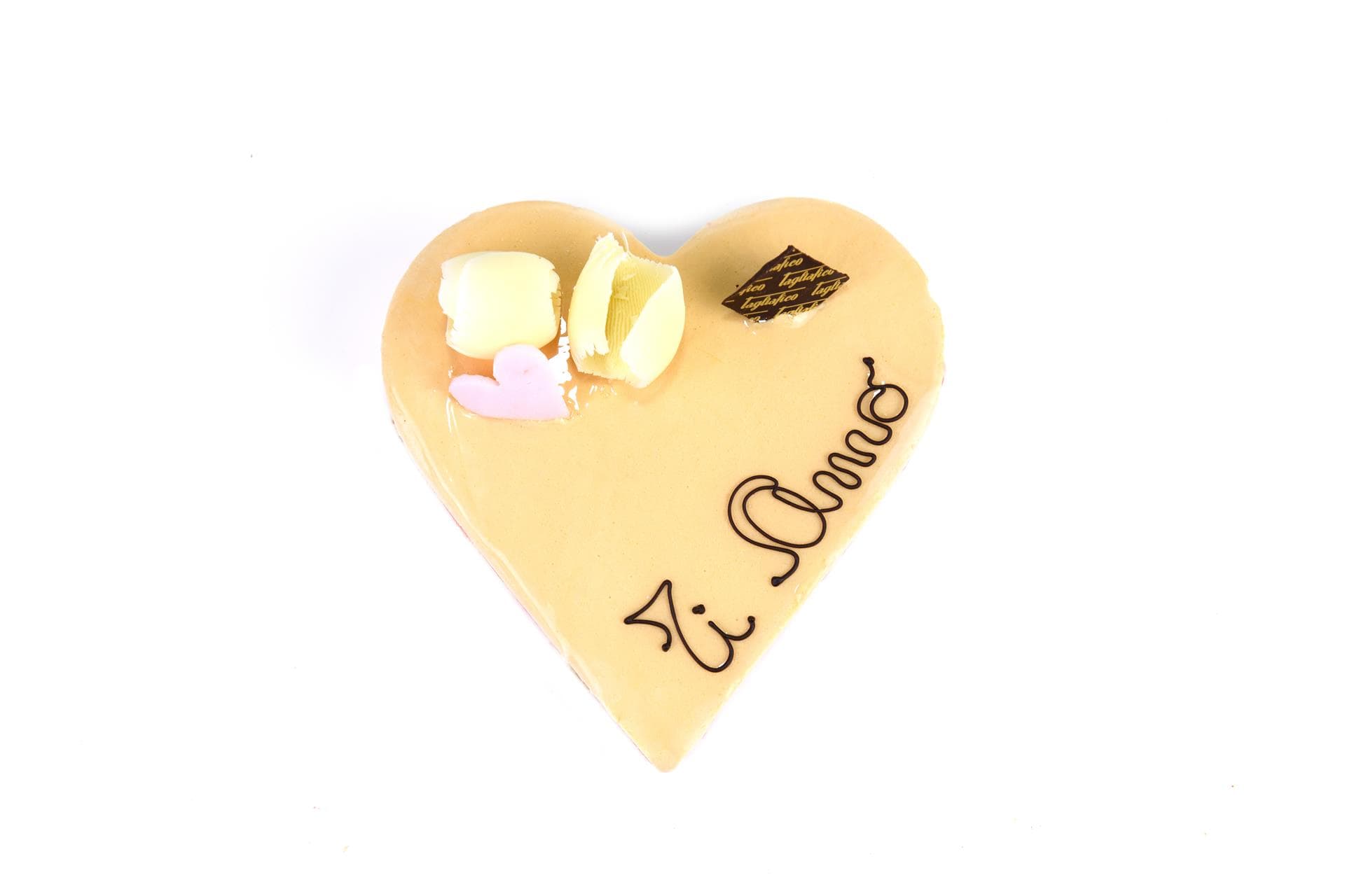 Sottili fiocchi di cioccolato bianco, un grazioso cuoricino e la scritta “ti amo” completano con un tocco sentimentale una torta degna di celebrare ogni istante romantico.