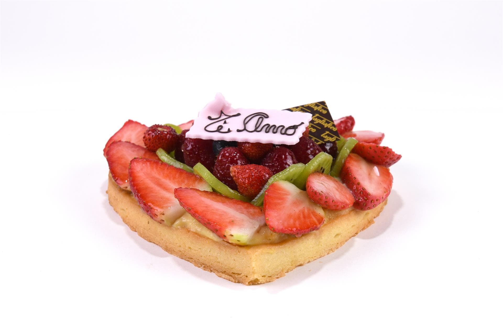 Il cuore di frutta è preparato con un disco di pasta frolla spalmato con uno strato di golosa crema pasticciera. Viene poi ricoperto da fragole e kiwi a fette e da una fantasia di frutti di bosco. Ogni frutto è selezionato e disposto con la massima cura per assicurare la totale perfezione estetica.
