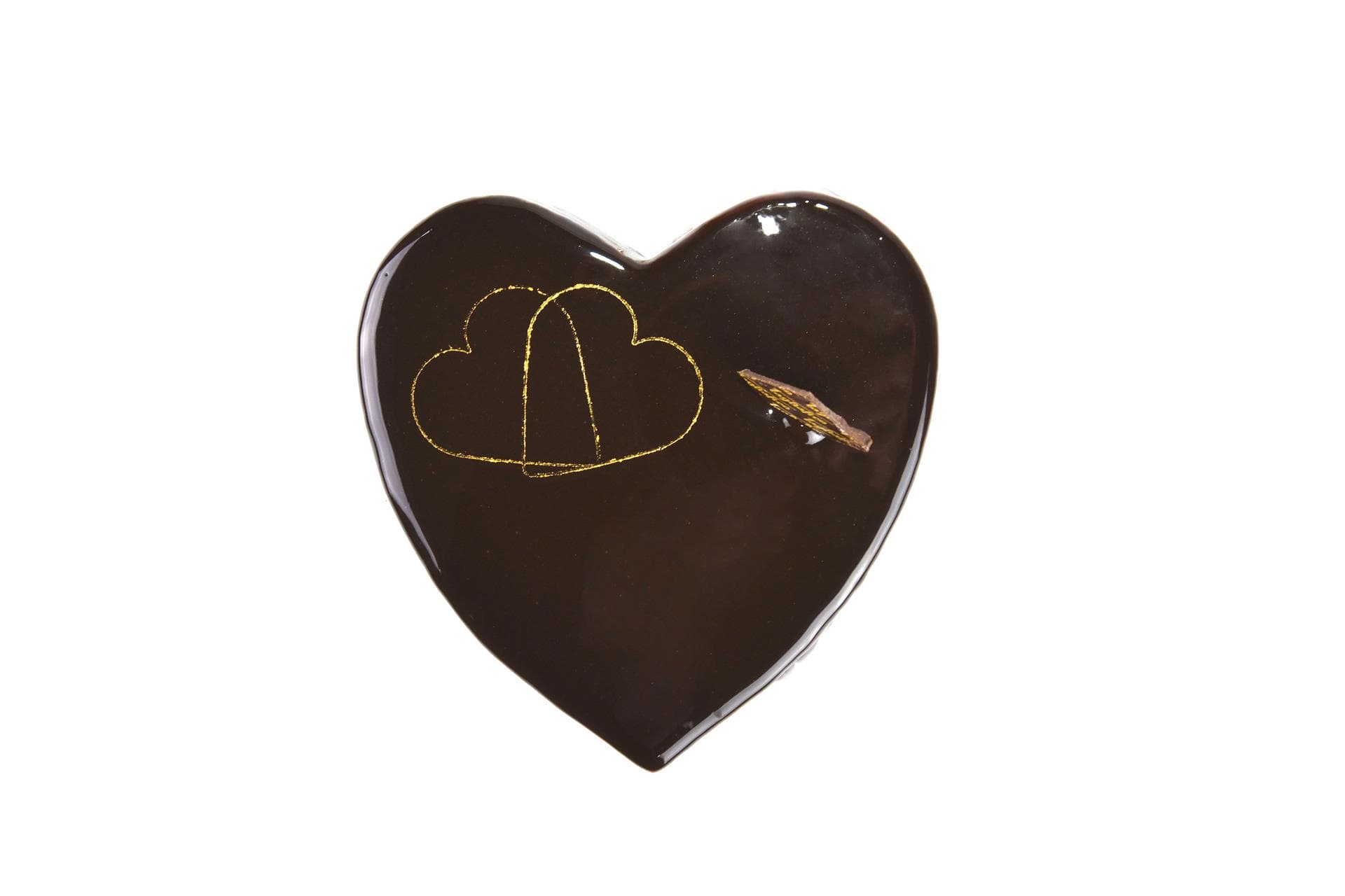 Alla base del cuore di mousse c’è un soffice strato di pan di Spagna bagnato con uno sciroppo di acqua e zucchero privo di alcol. Viene poi aggiunto uno strato di mousse al cioccolato preparata con panna fresca, cacao Guanaja e una pâte à bombe, una crema di tuorli d’uovo e zucchero cotta e montata.
