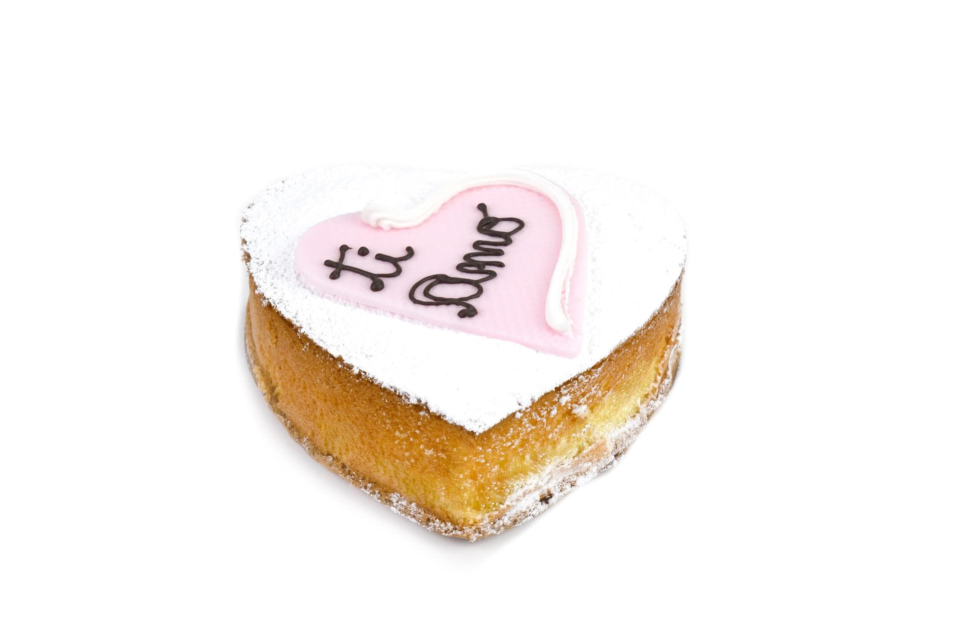 La tradizionale decorazione con zucchero a velo è completata da un poetico cuore rosa e dalla scritta “ti amo”.