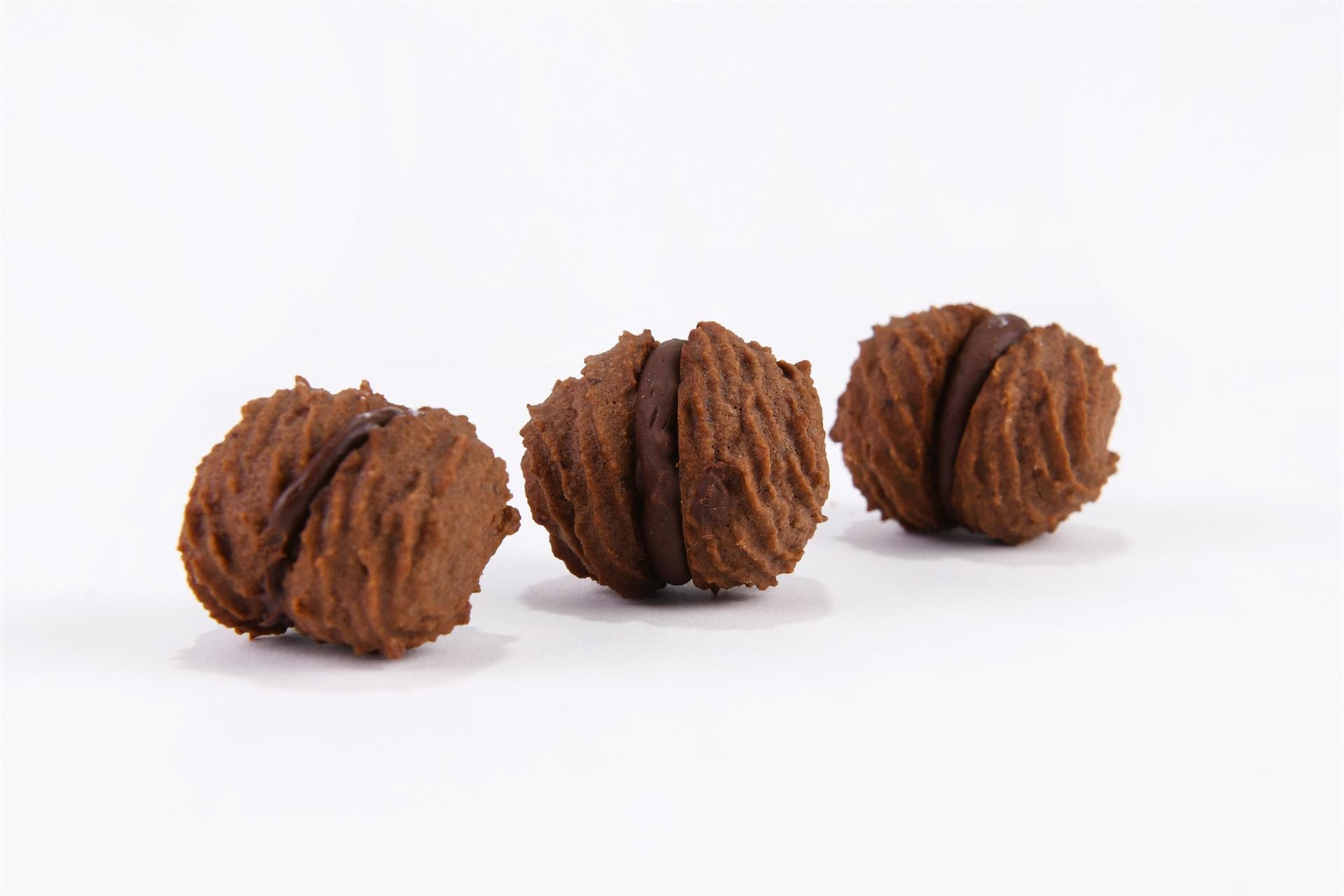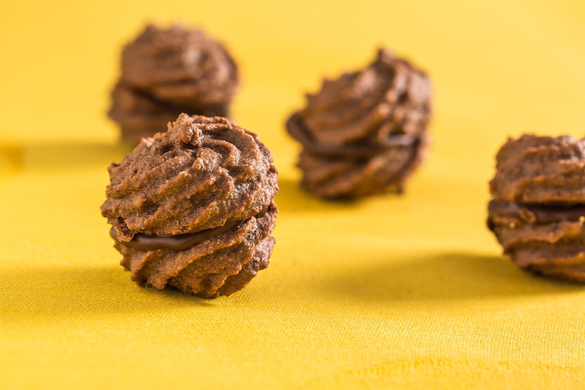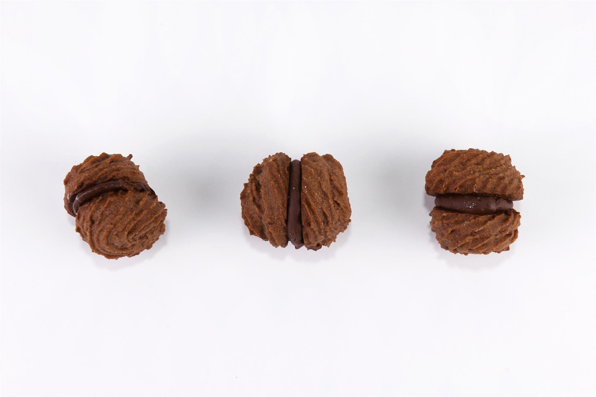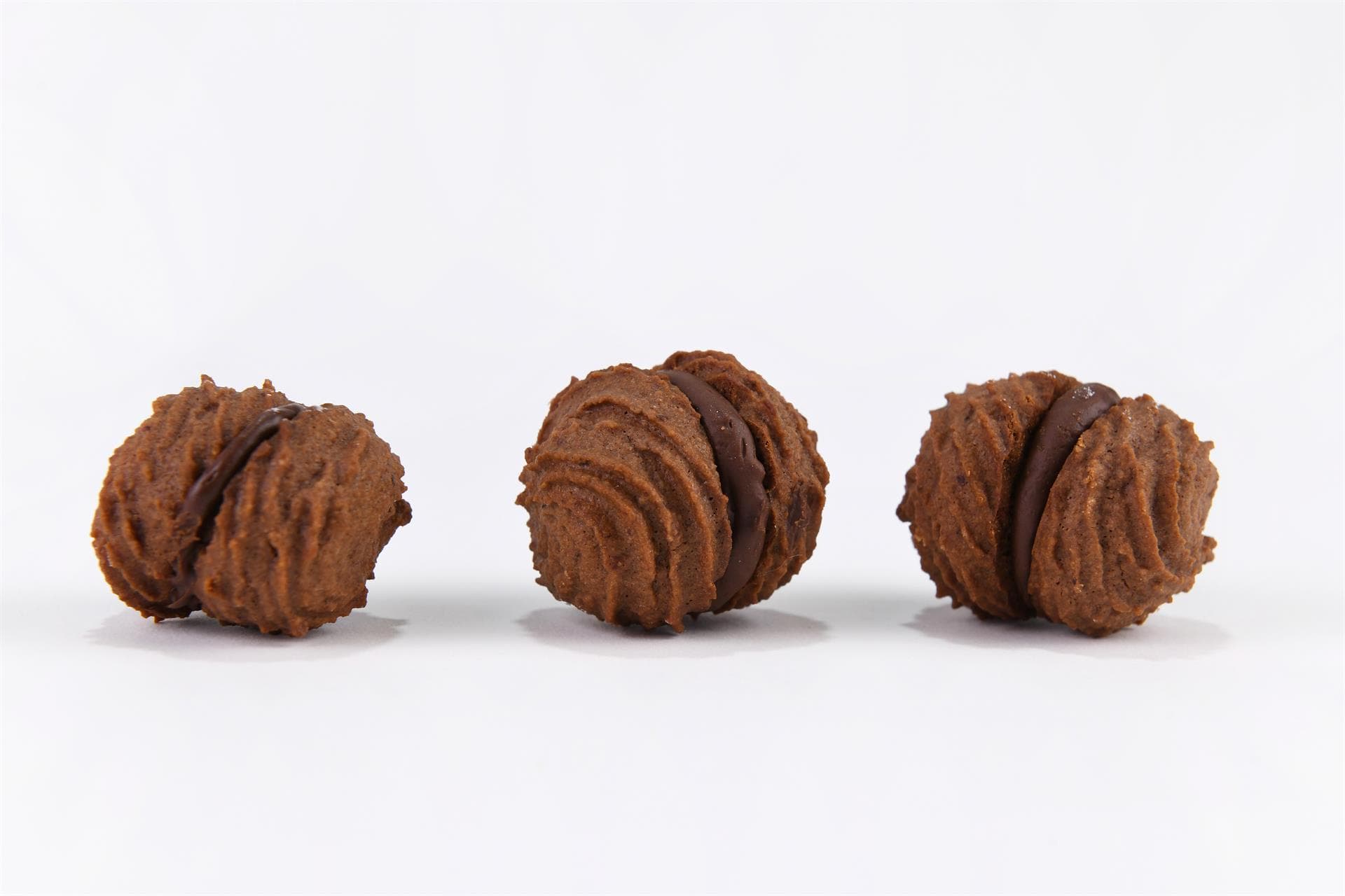 Sono dolci sensuali nel nome e nella forma. Due rosette di cacao e nocciola che si sfiorano come le labbra di due innamorati racchiudendo una ganache di cioccolato fondente.