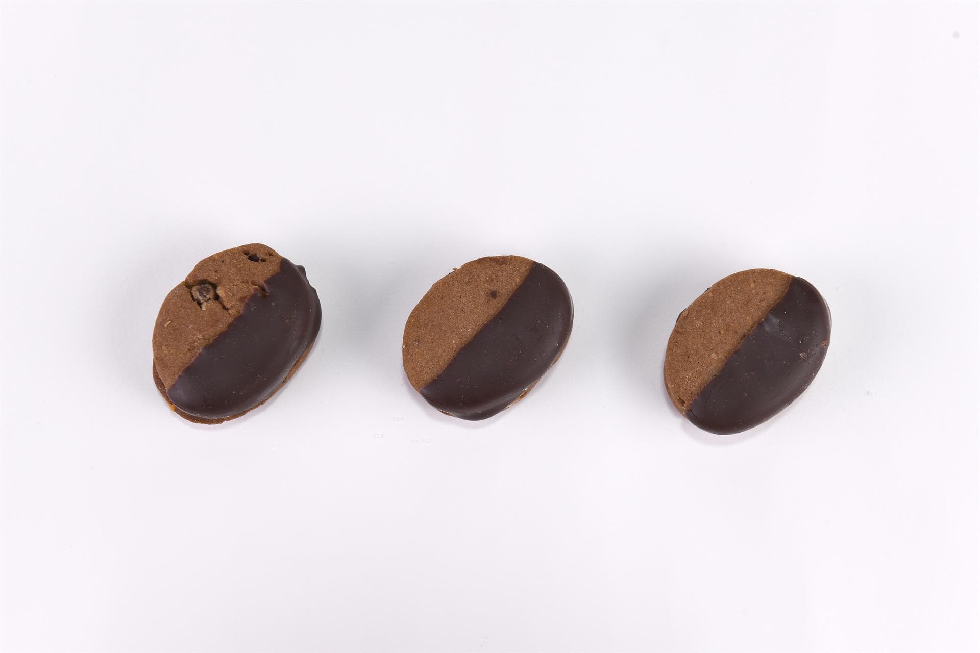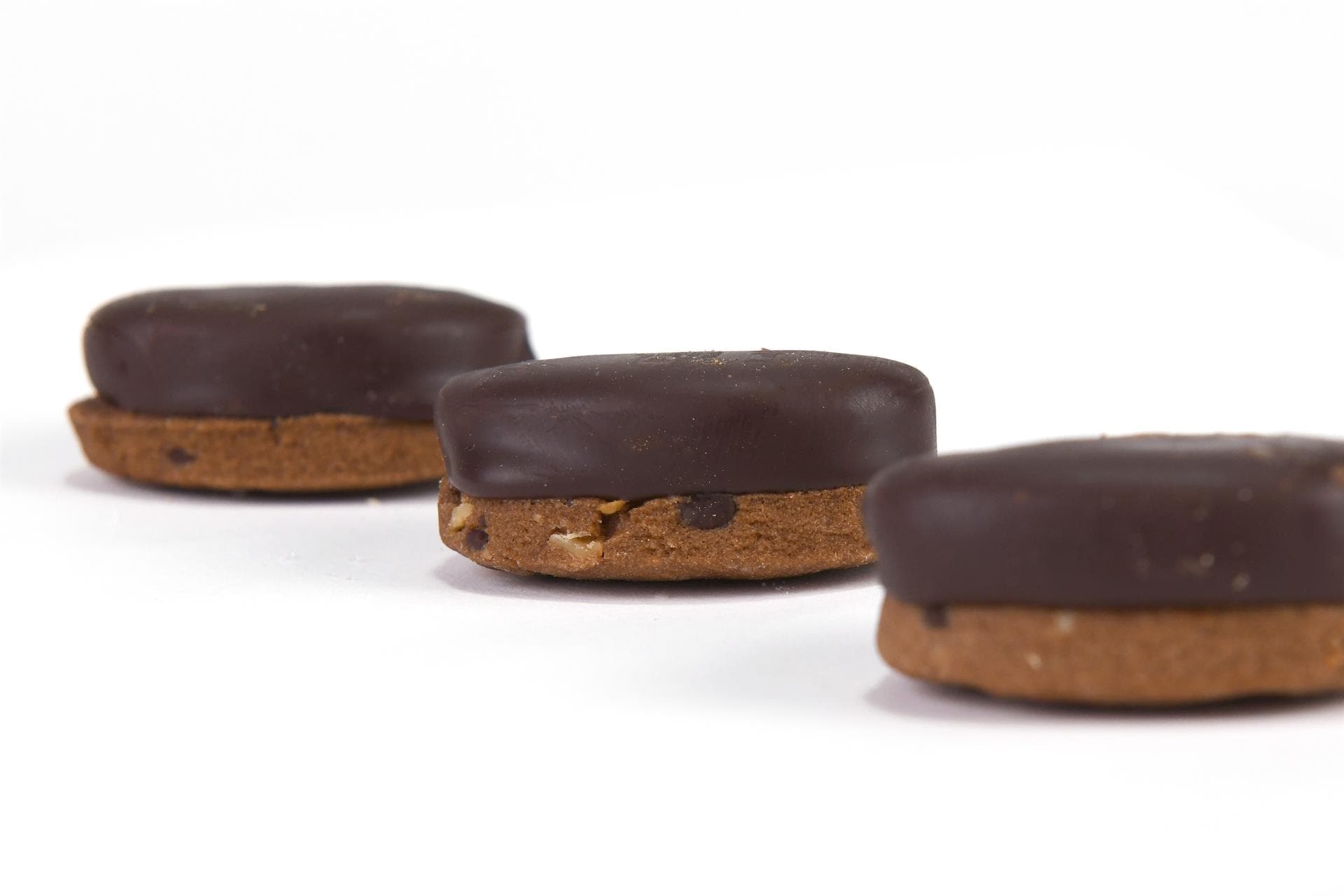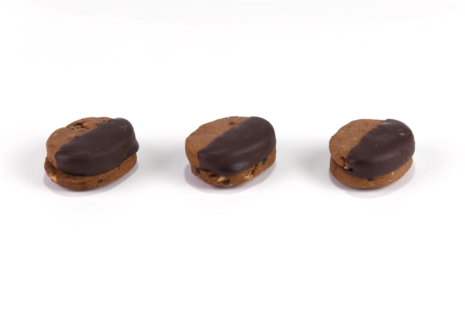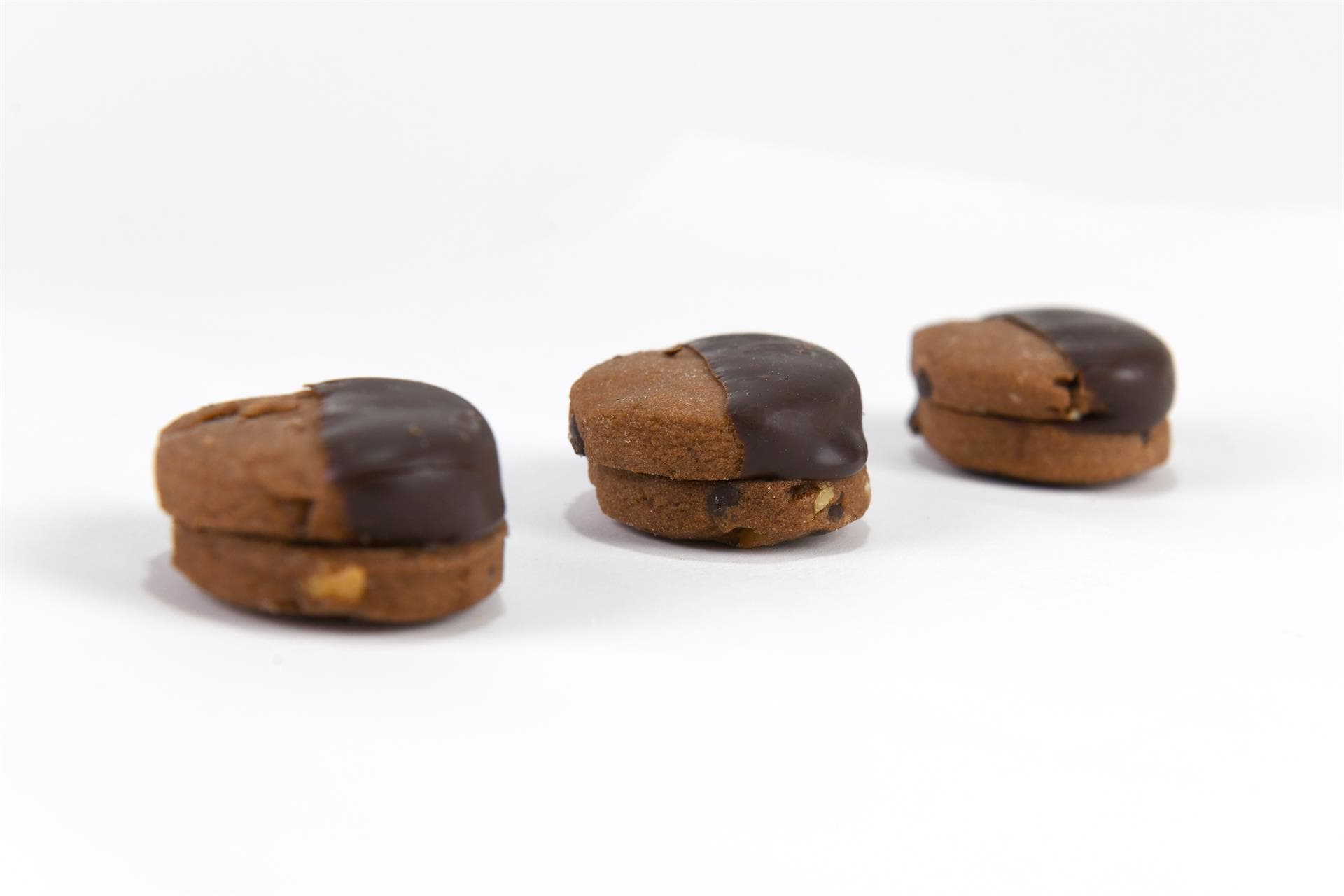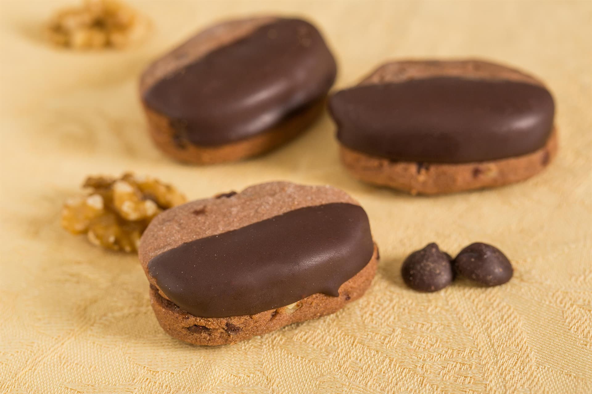 Un impasto friabile a base di burro, cacao e noci spezzettate avvolto in una glassa di cioccolato fondente.