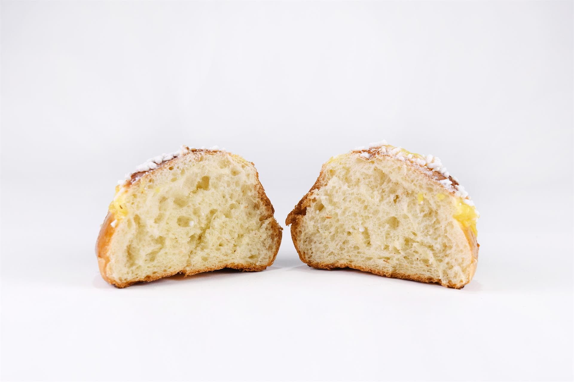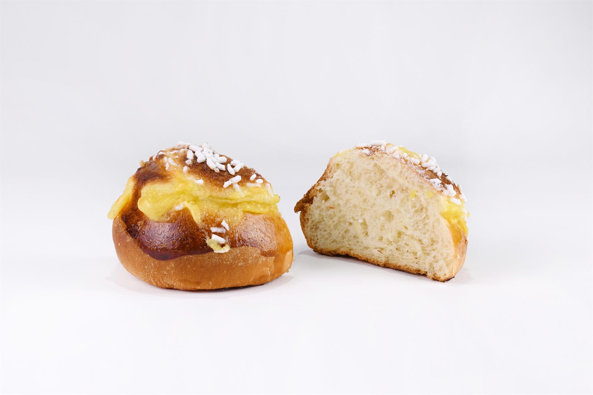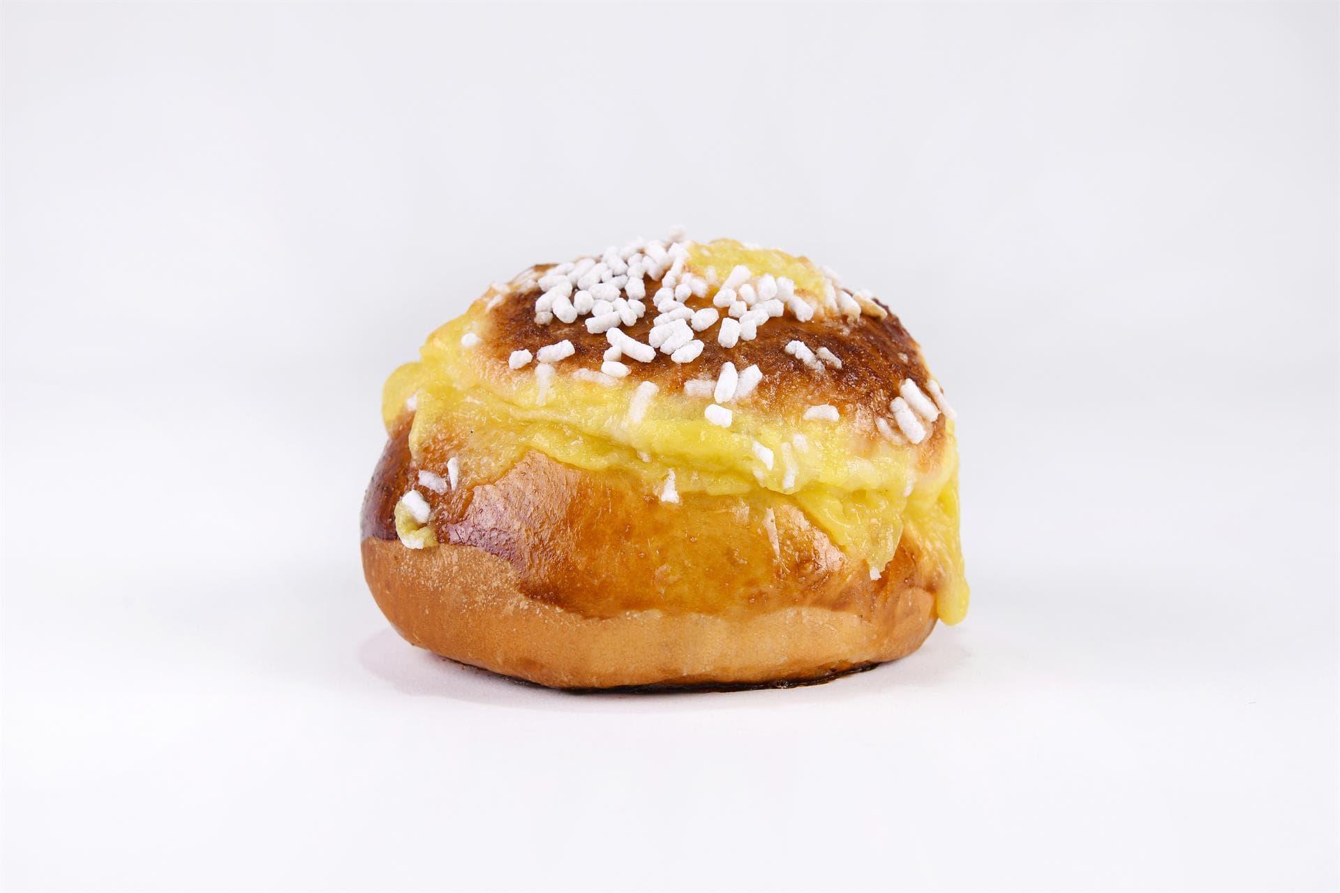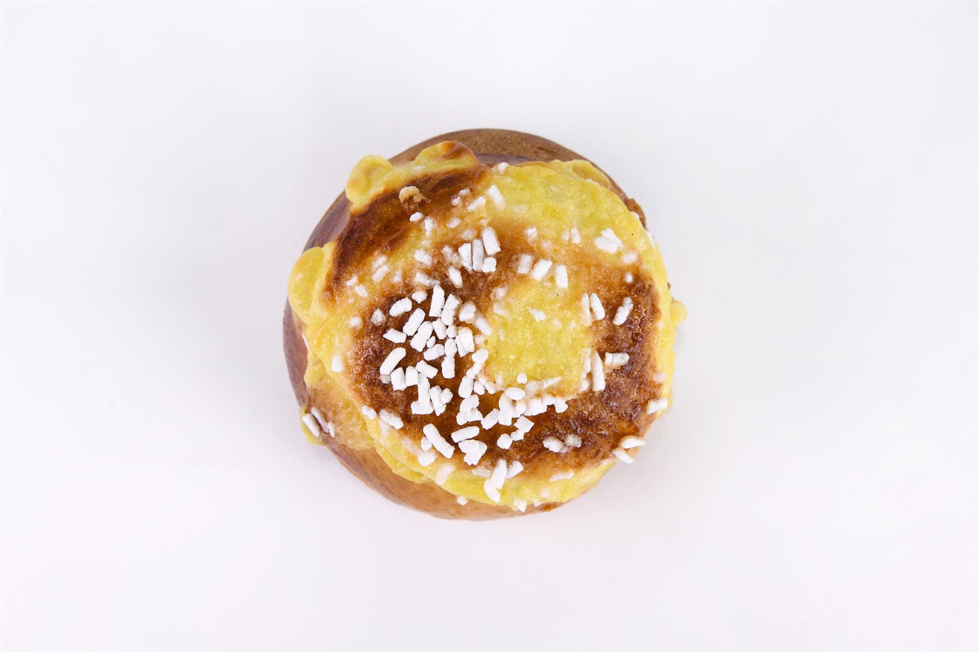 Mezza sfera di impasto brioche, crema pasticcera alla vaniglia e limone e una delicata pioggia di granella di zucchero.