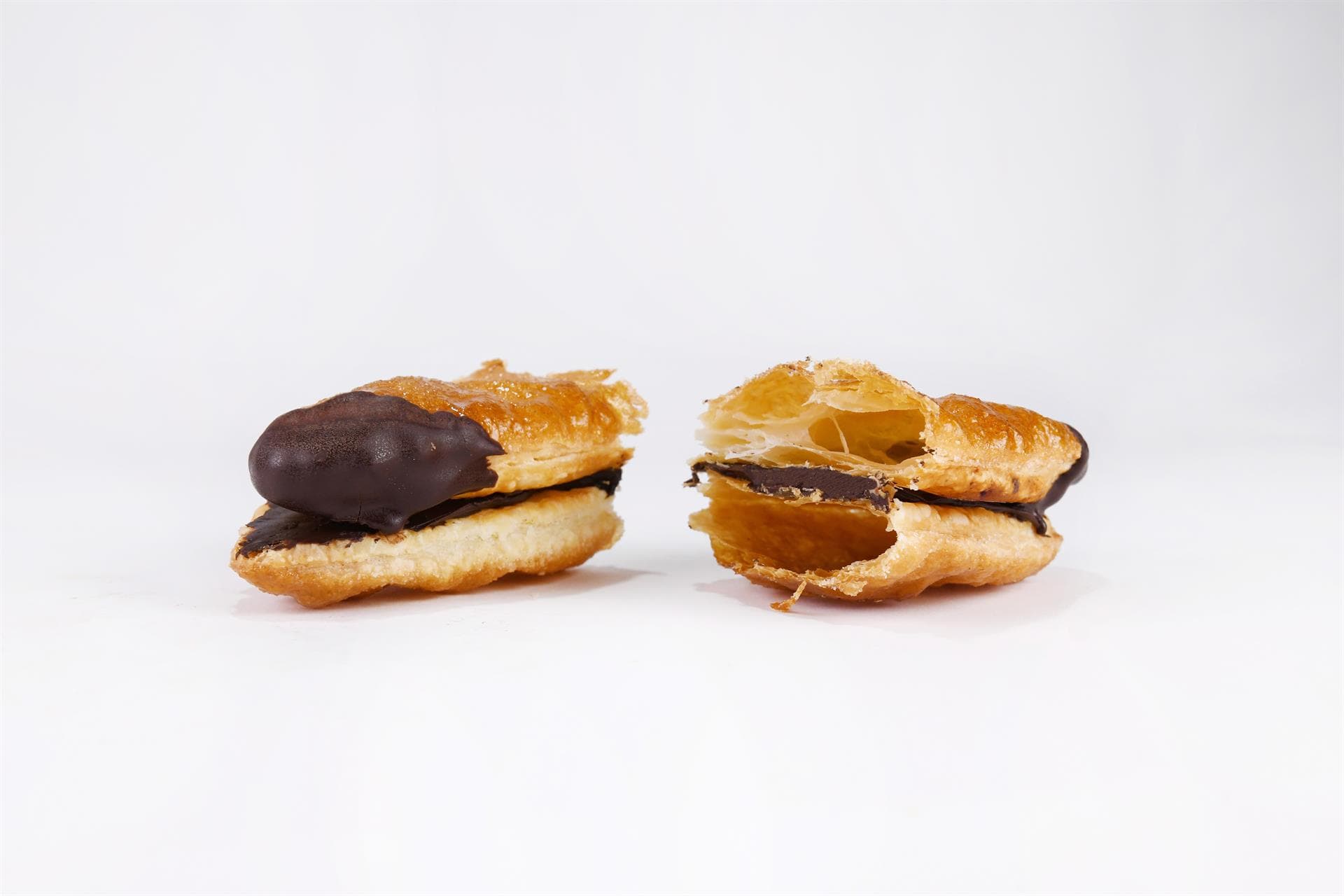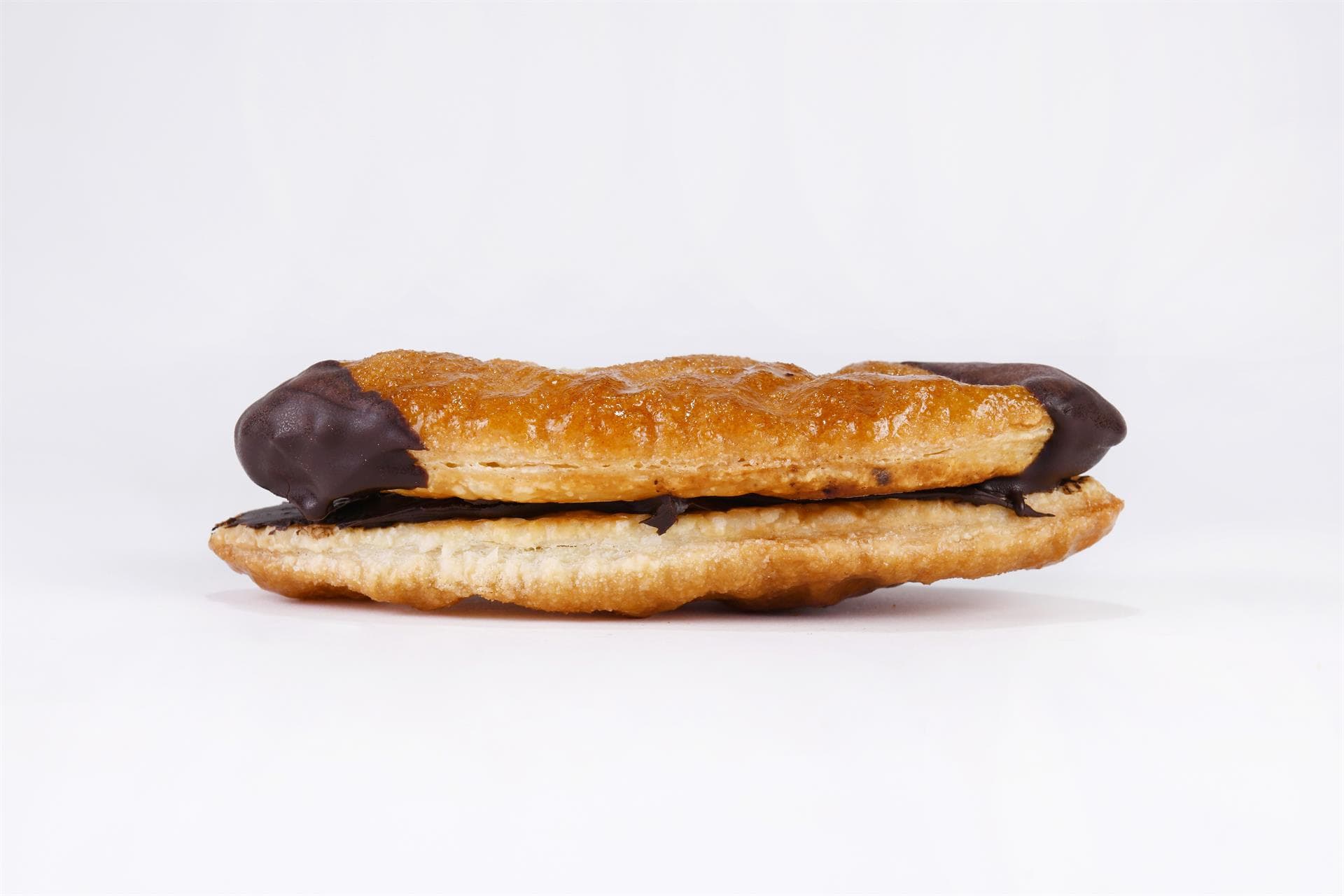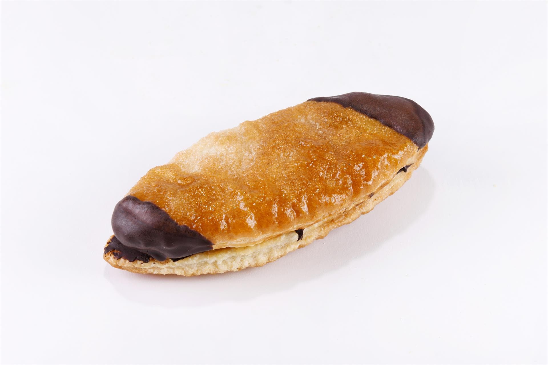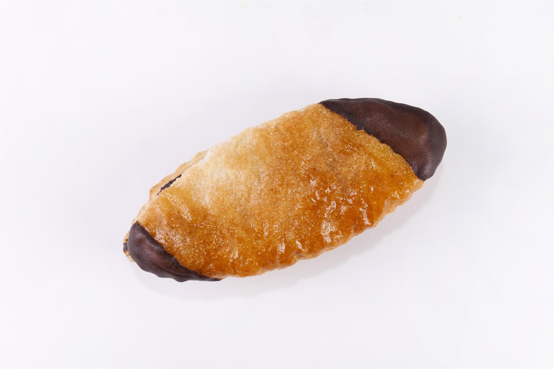 Nella ricetta originale viene farcita con crema pasticcera aromatizzata al limone. Noi la proponiamo in una versione originale ripiena di crema al cioccolato e nocciole e con una sottile glassa di cioccolato fondente alle due estremità.