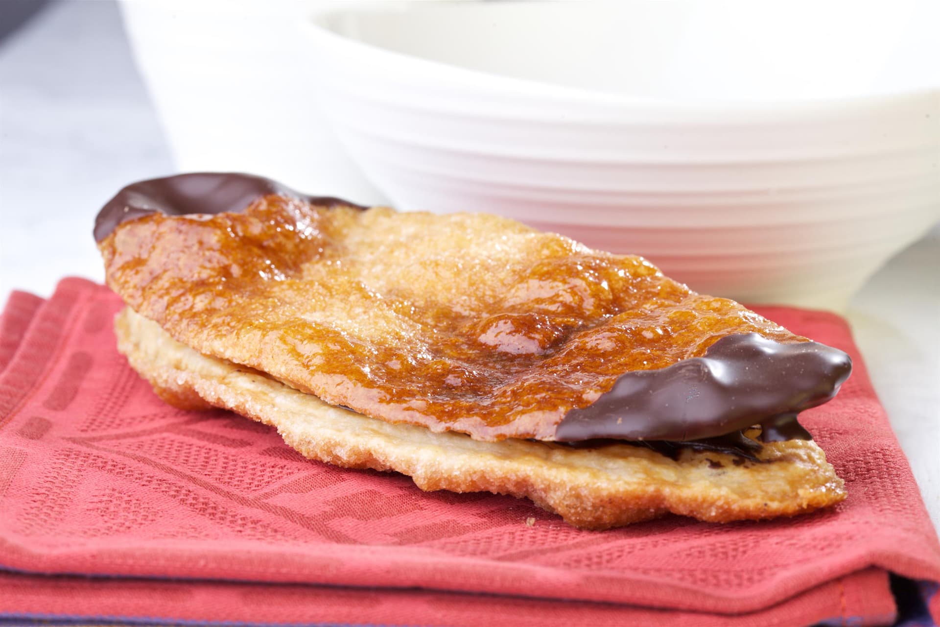 Ben riconoscibile per la forma stretta e allungata è preparata con due croccanti strisce di pasta sfoglia sovrapposte e lucidate con un velo di caramello.