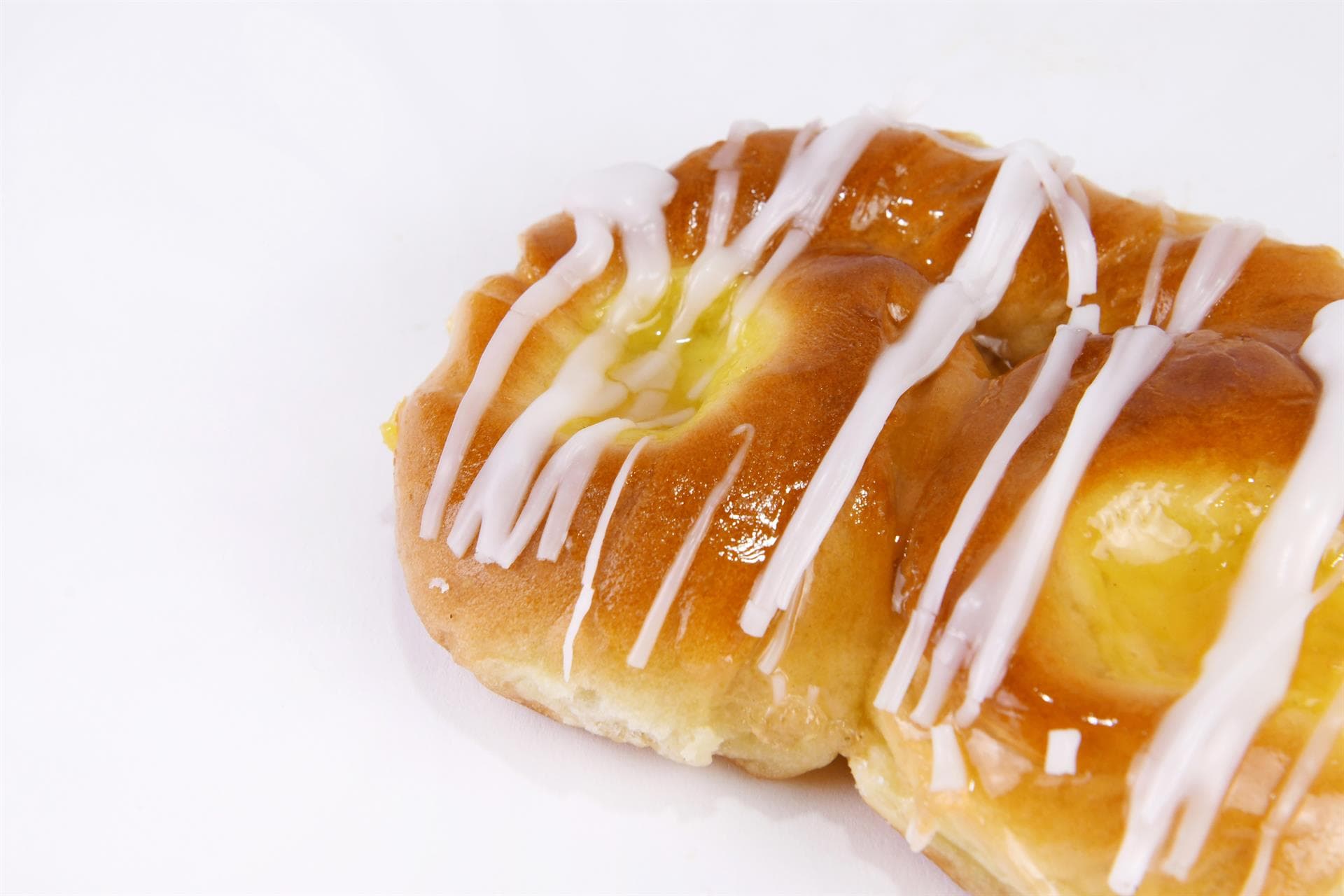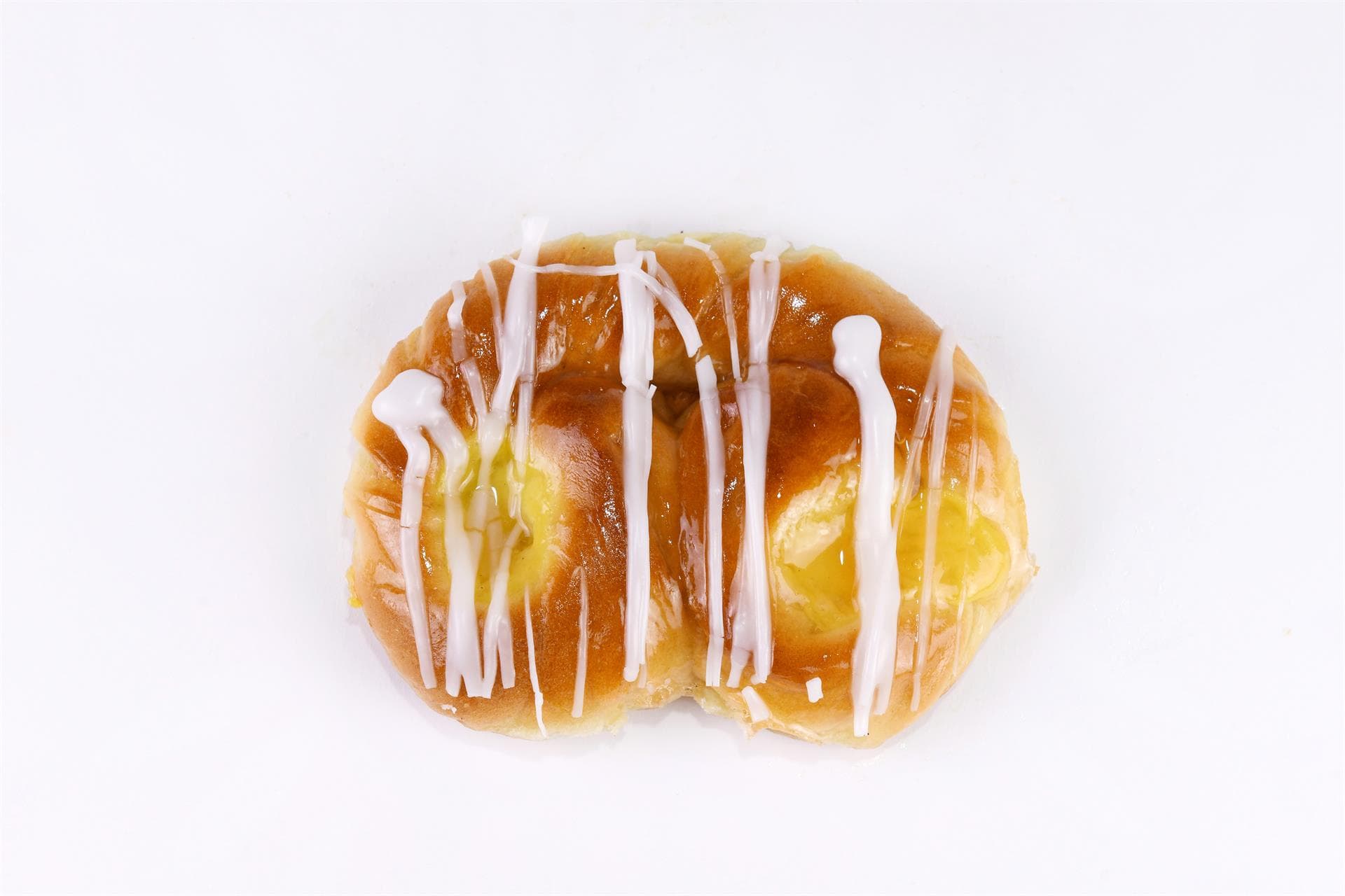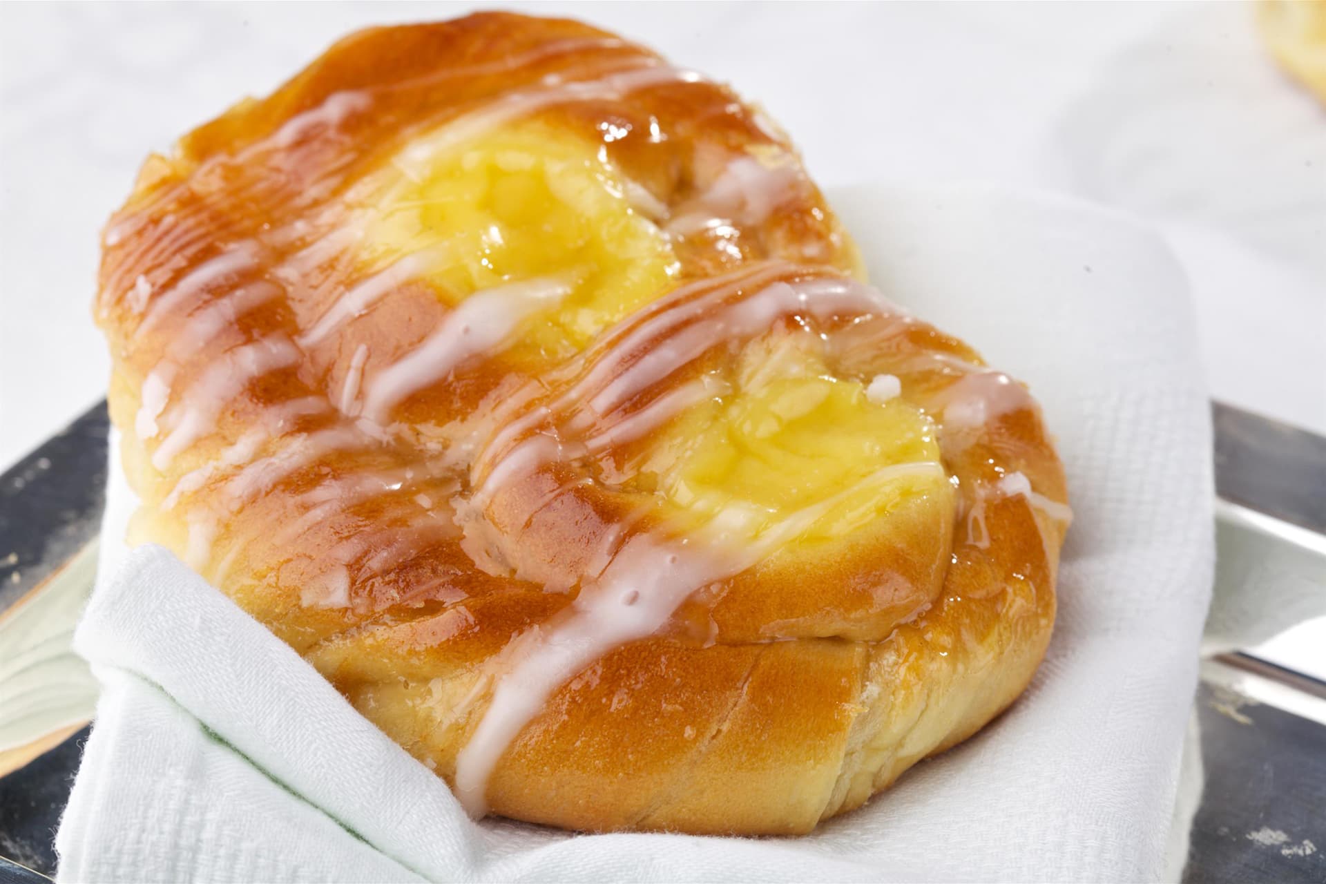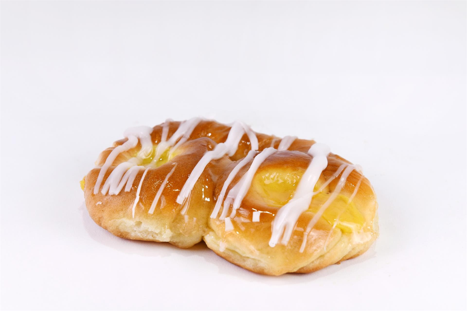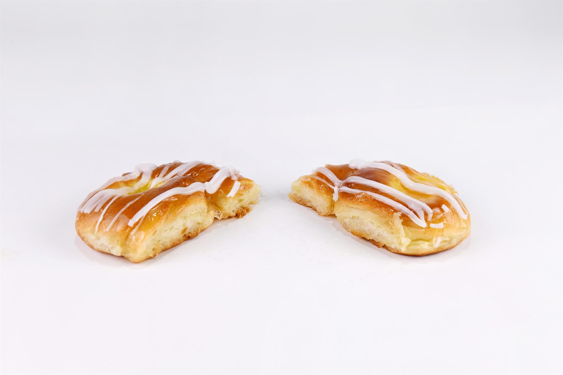 Treccia di impasto brioche con due cuori di crema pasticcera alla vaniglia bagnata all'aroma di maraschino e rigata di zucchero fondente.