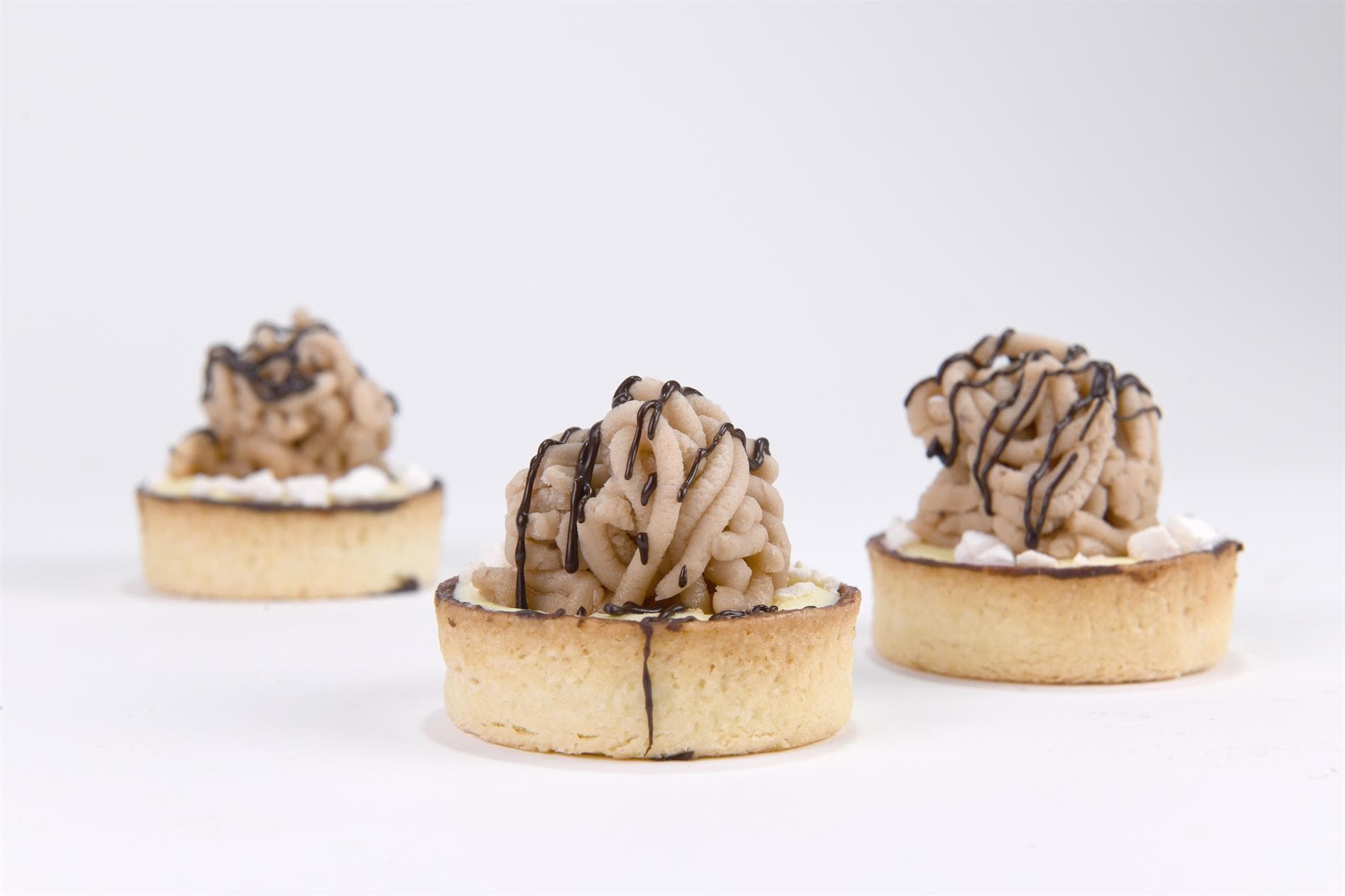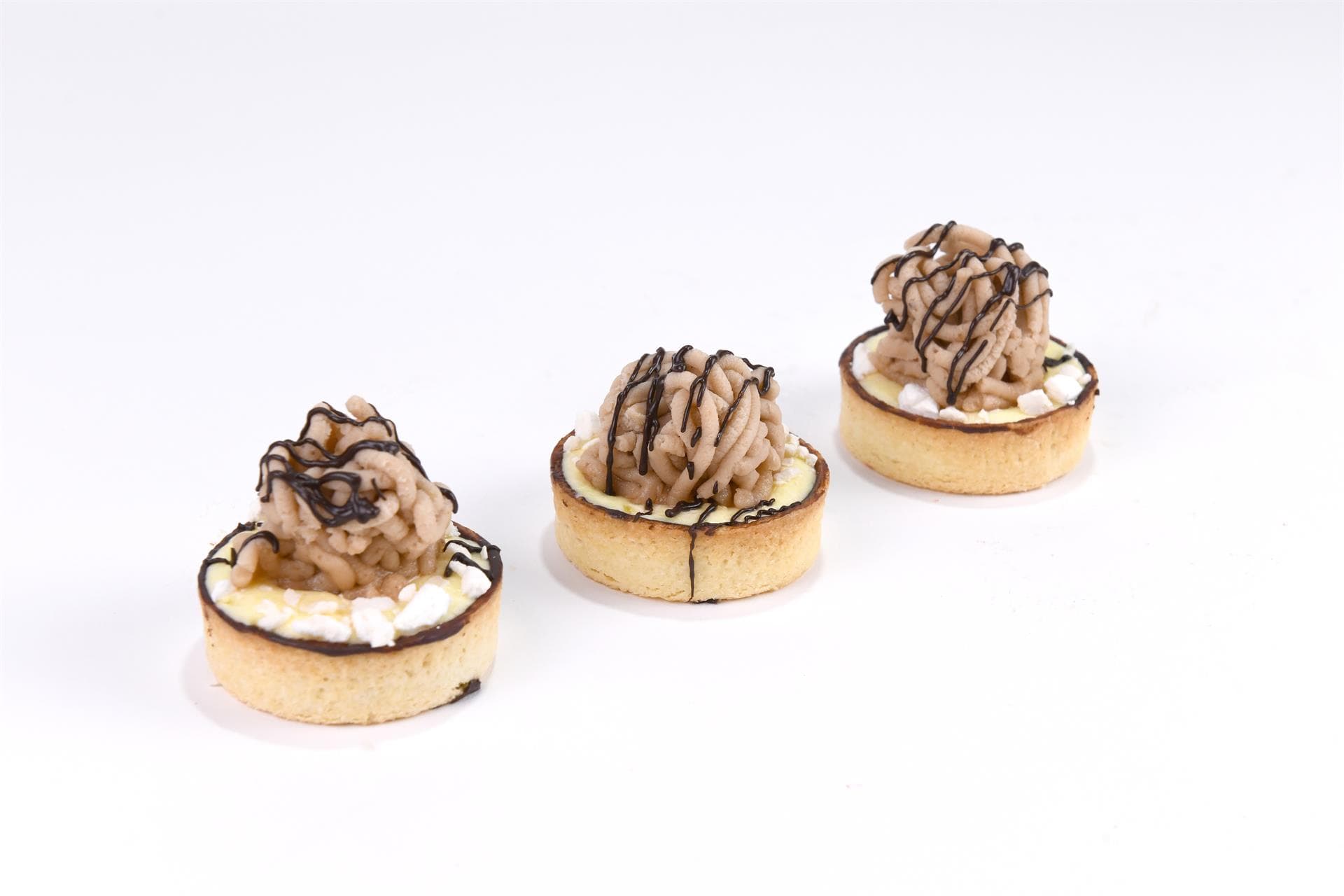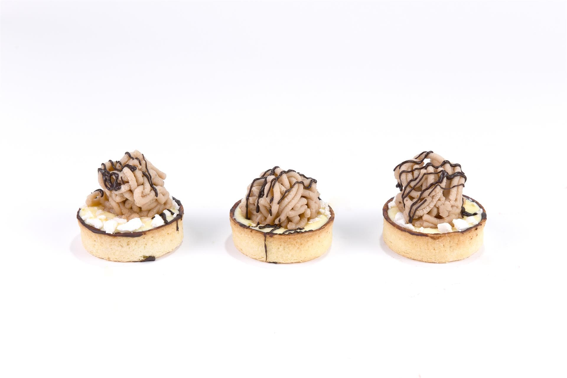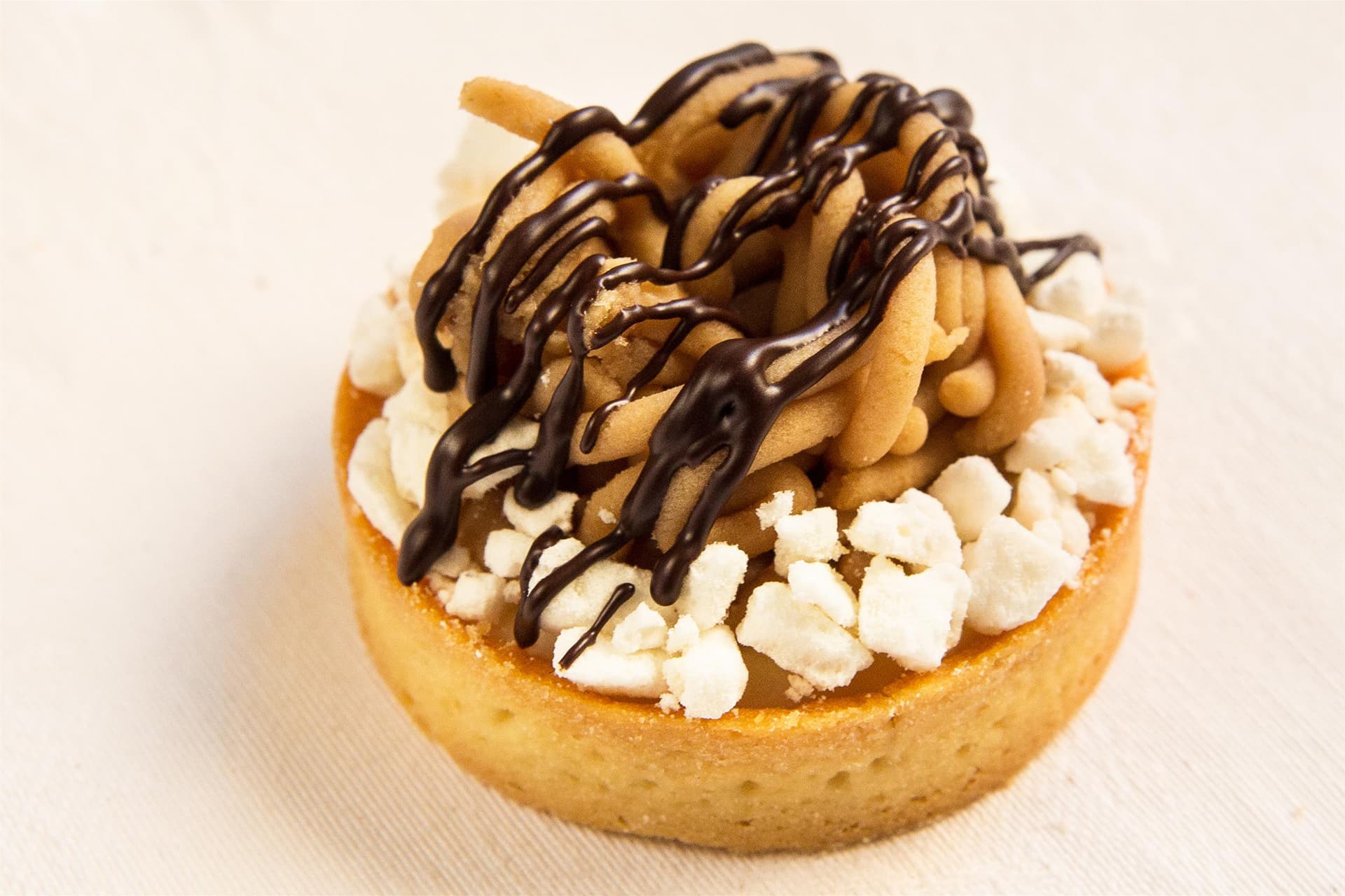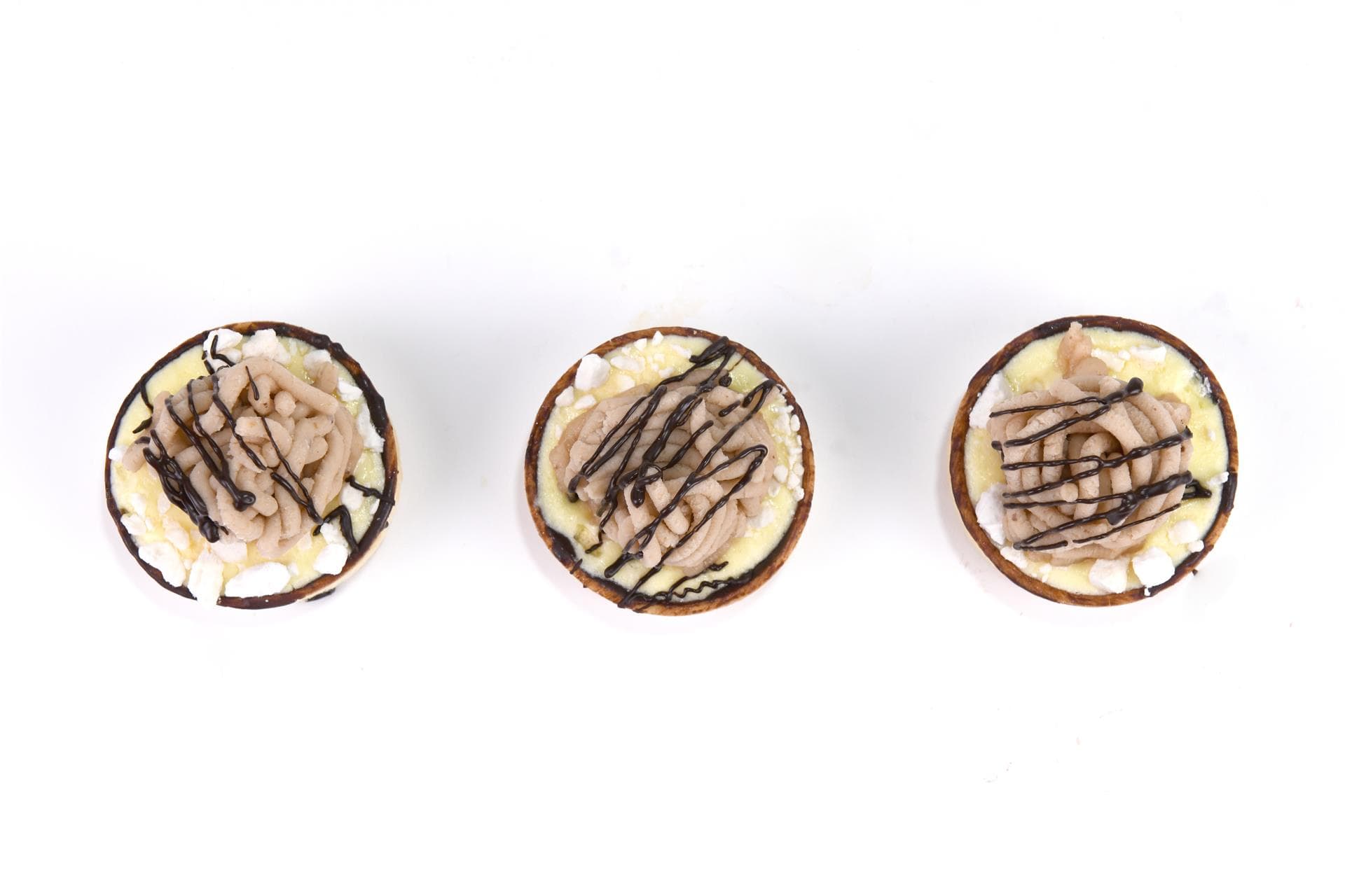 Cremoso alla vaniglia, fiocchi di meringa e polpa di castagne sostenuti da una frolla croccante pennellata di cioccolato 70%.