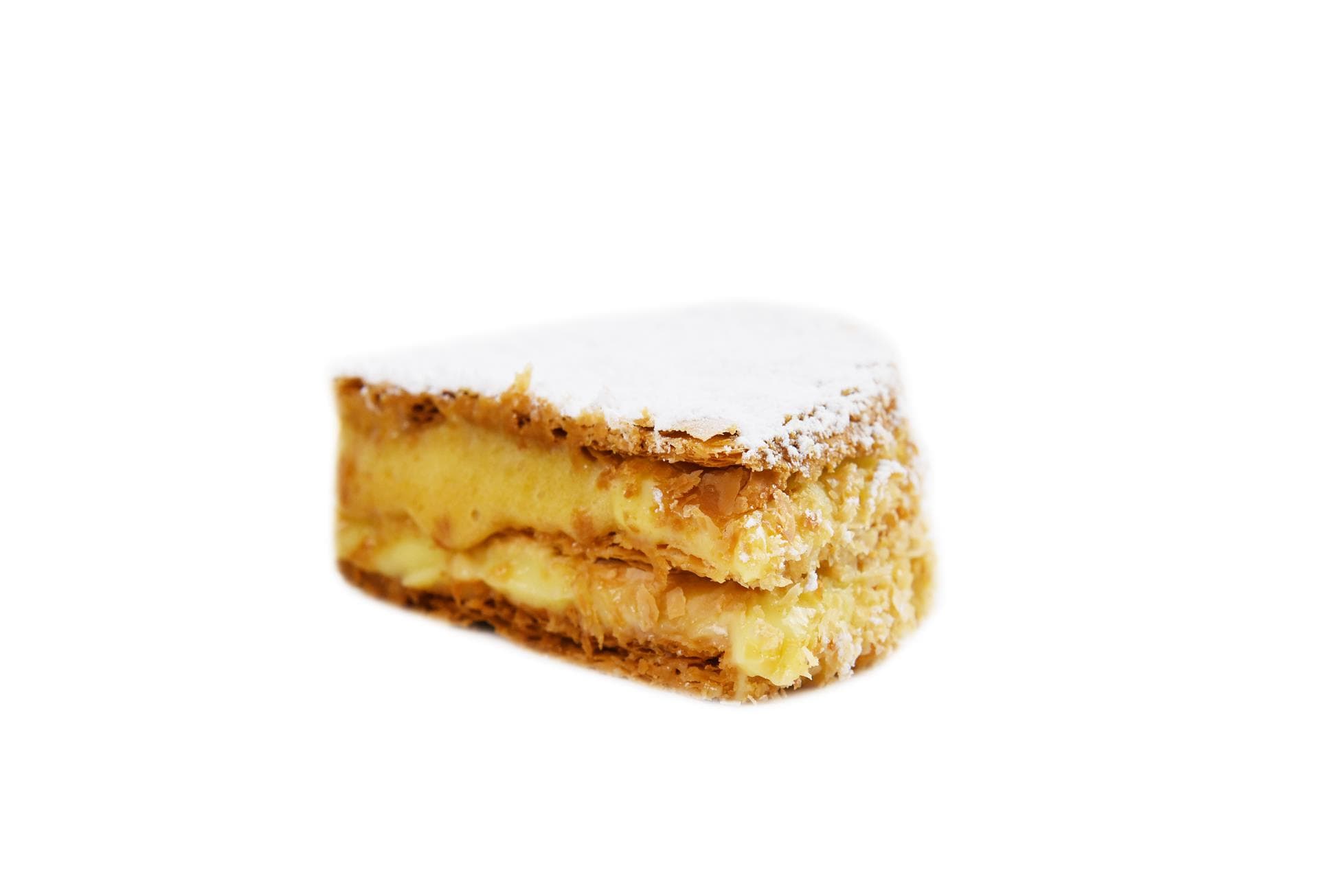 Tre fragranti sfoglie caramellate farcite con uno strato di crema pasticcera alla vaniglia del Madagascar e uno strato di zabaione montato fresco e ricoperte di zucchero a velo.