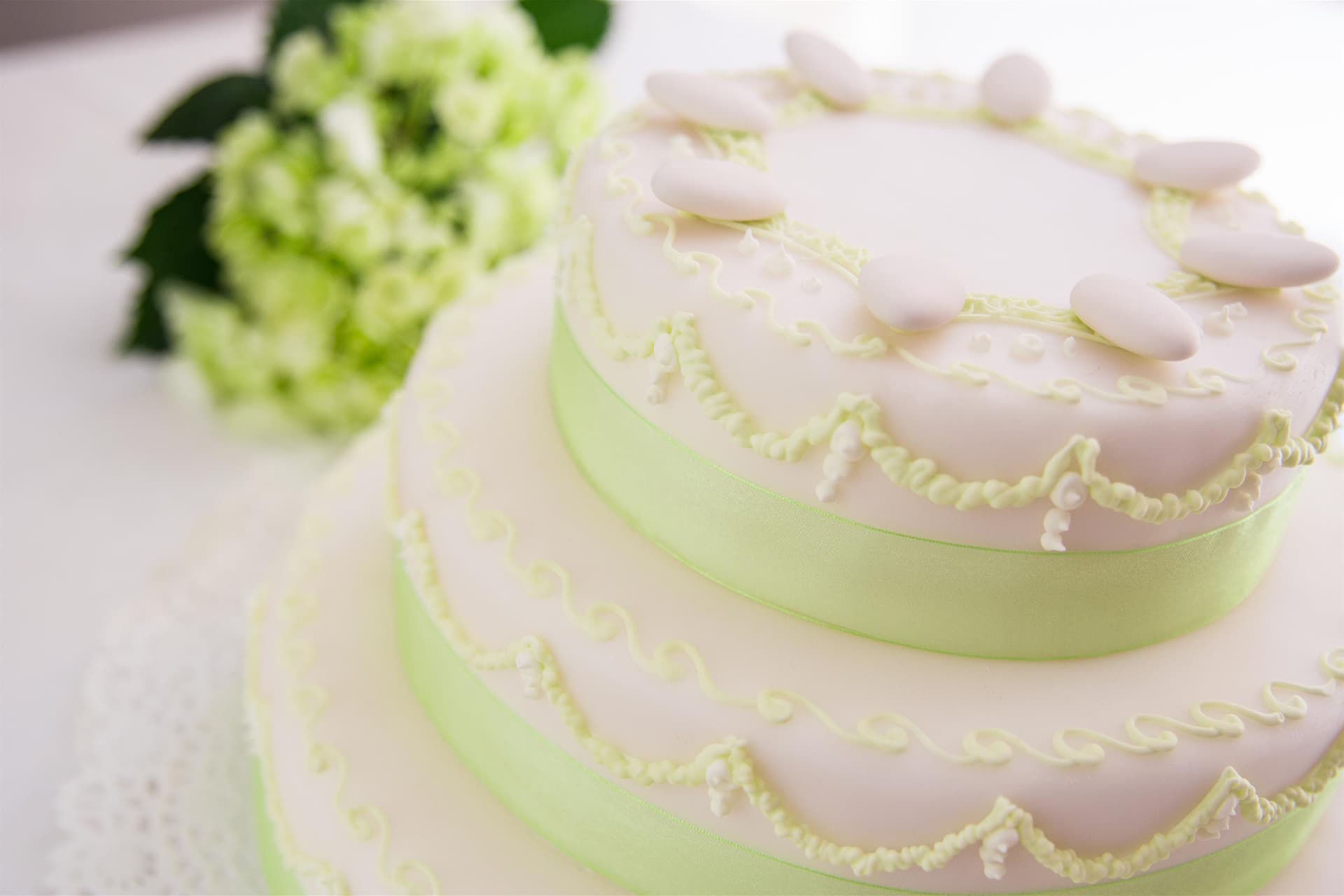Tre piani di morbido pan di Spagna farcito di crema imperiale, ricoperto di pasta bianca alla mandorla e finemente decorato.