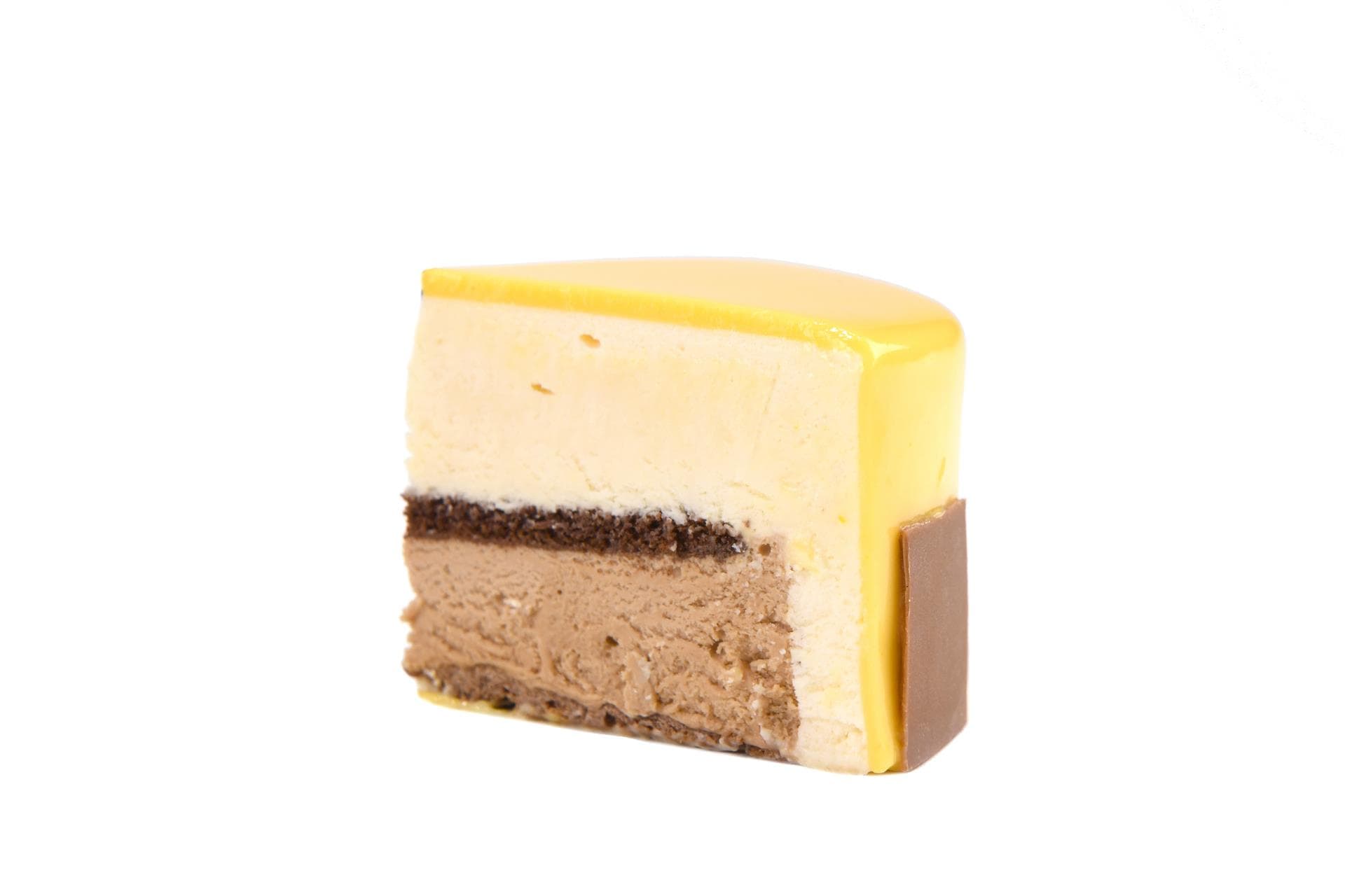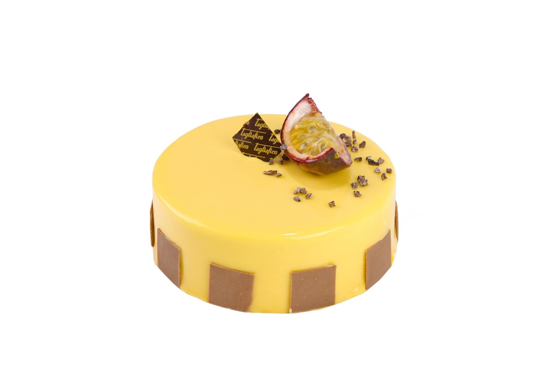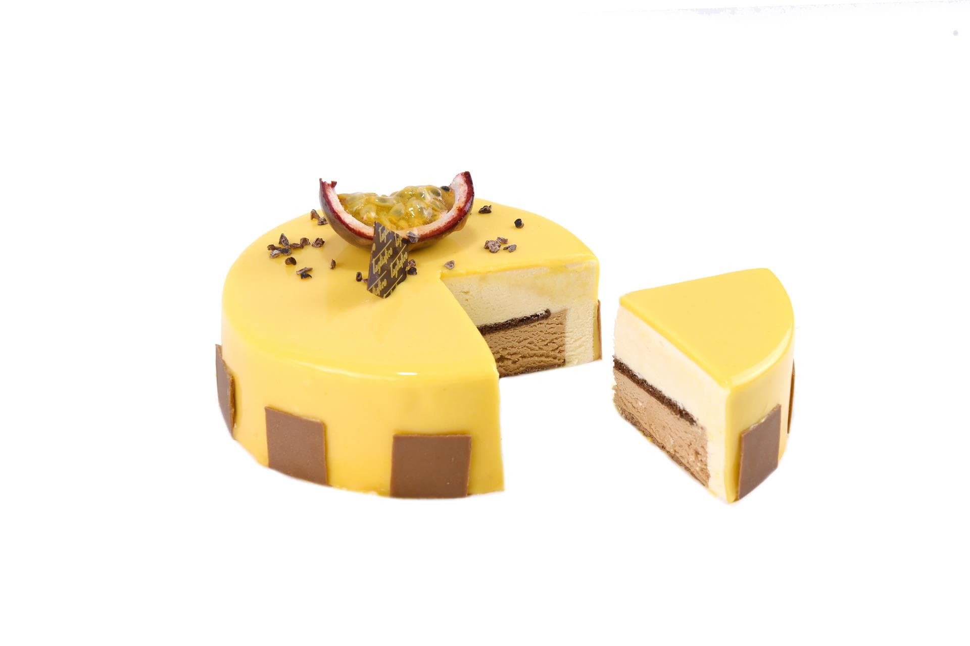 Un croccantino friabile di wafer, gianduia e cioccolato fondente forma la base per una mousse al cioccolato al latte biscottato coperta da un sottile foglio di pan di Spagna al cacao. Questa anima di cioccolato è racchiusa in una delicata mousse al frutto della passione ricoperta da una glassa al frutto della passione e mango.