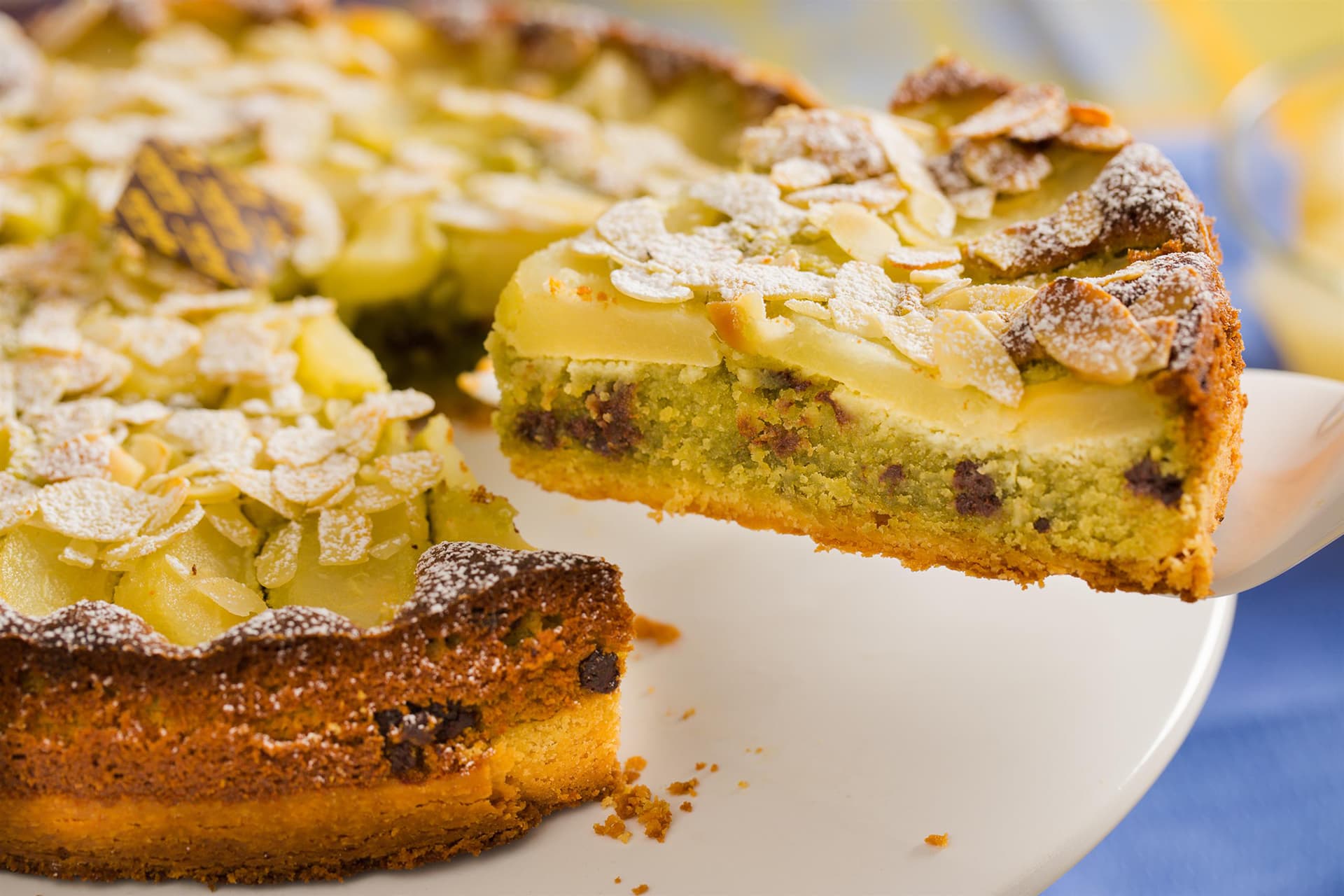 La prepariamo con una base di pasta frolla friabile coperta di crema frangipane alla mandorla con gocce di cioccolato e pistacchi.