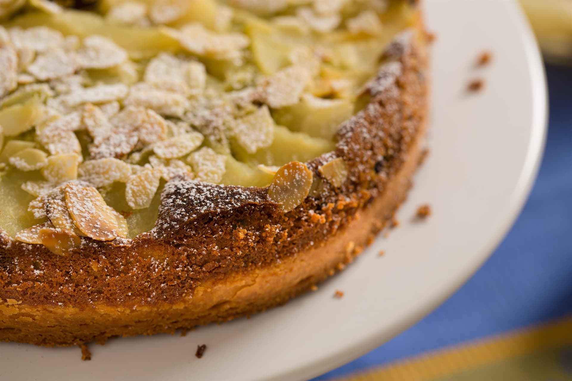 Su questa base stendiamo un velo di pere sciroppate a fette ricoperte da croccanti sfoglie di mandorle.